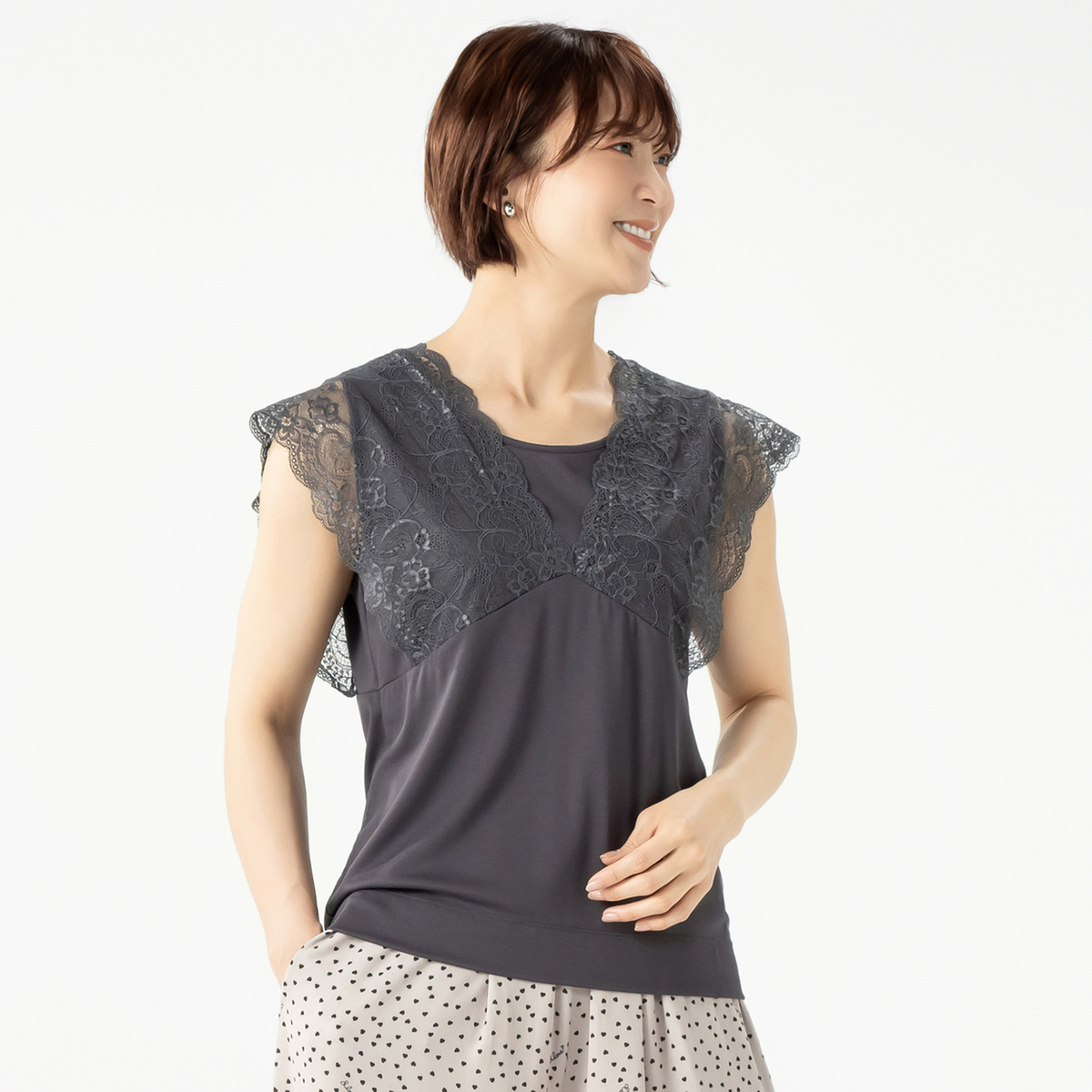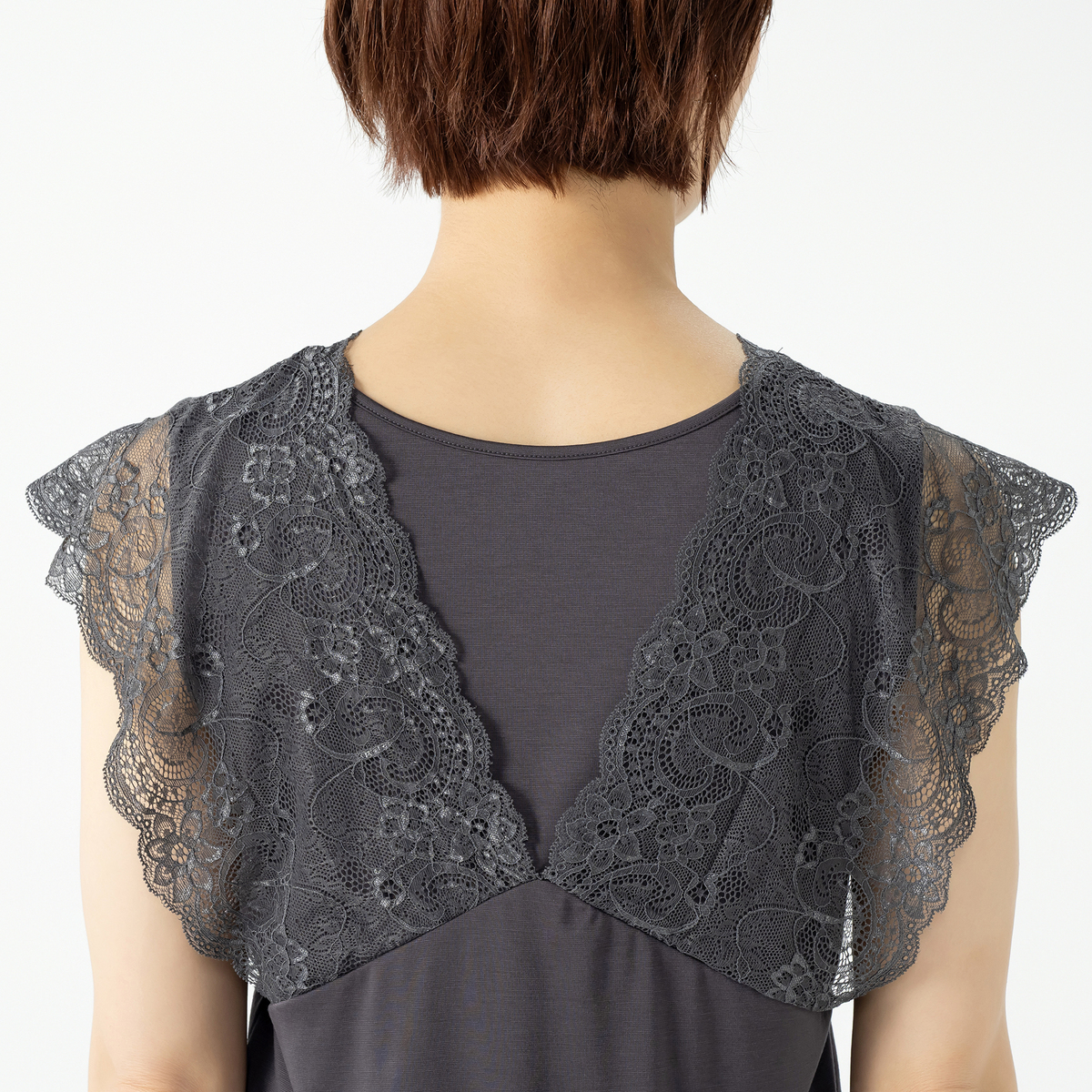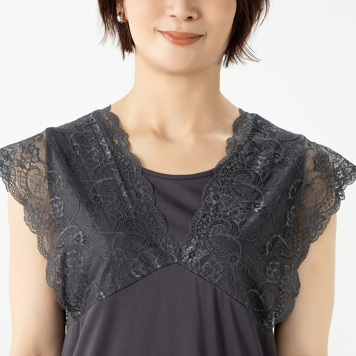 接触冷感素材で涼やかに。トップス感覚で着られ、胸元から袖にかけて繊細なストレッチレースを使用。レース切替デザインで華やかさと上品さをプラスしています