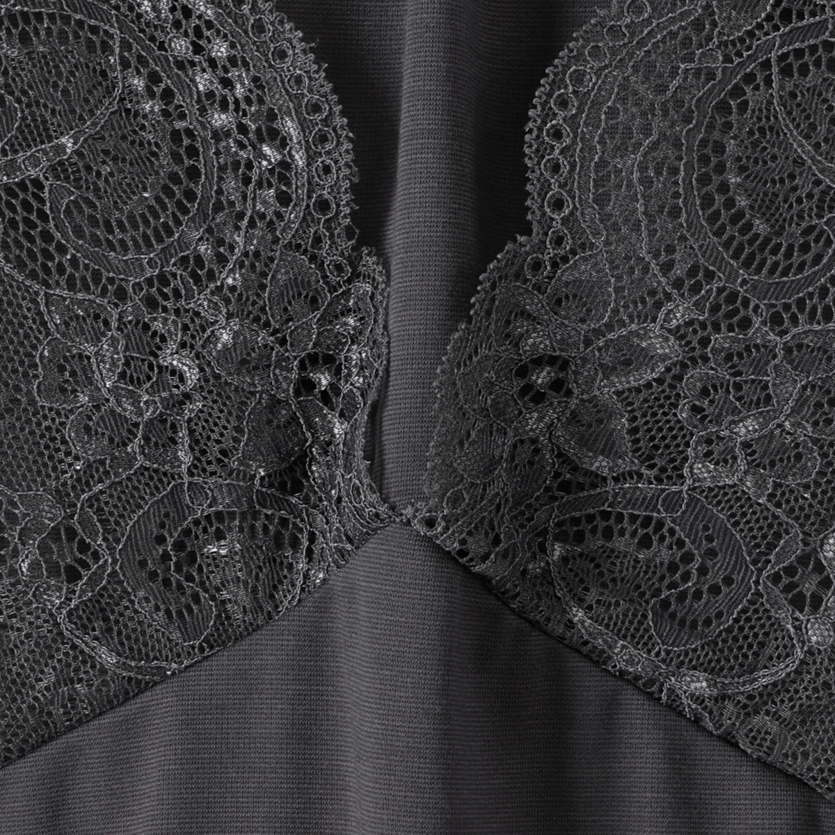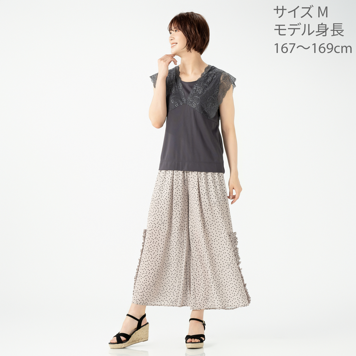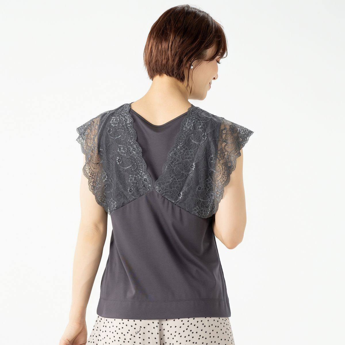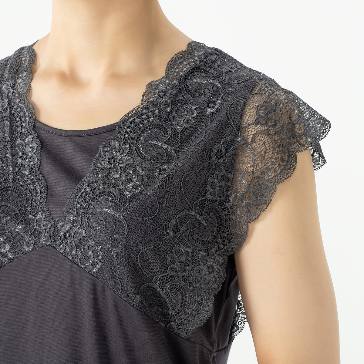 接触冷感素材で涼やかに。トップス感覚で着られ、胸元から袖にかけて繊細なストレッチレースを使用。レース切替デザインで華やかさと上品さをプラスしています