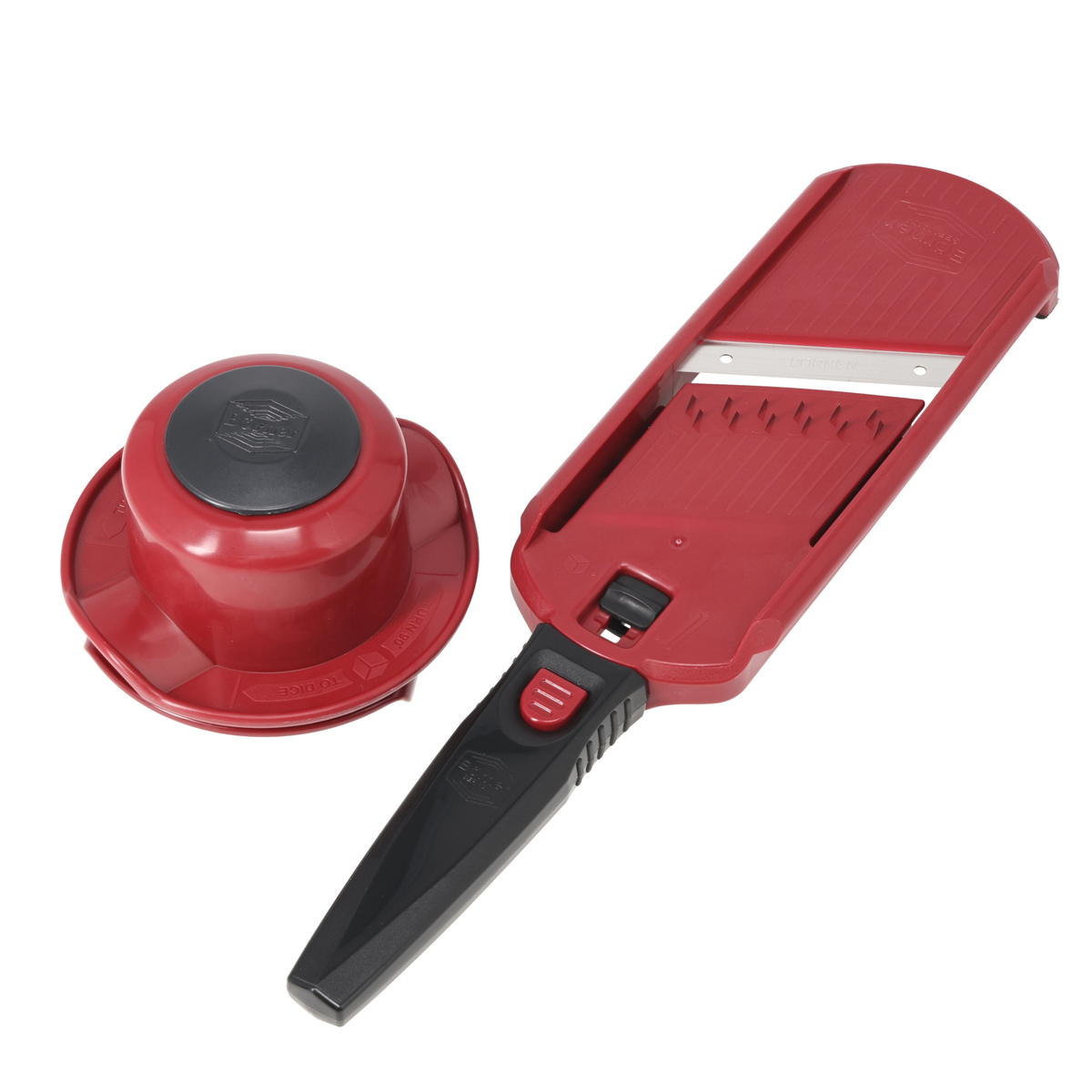スライサーの両サイドとぴったり接するよう設計されたガイドツールと、安全ホルダーを使用することで野菜が小さくなっても最後までスライスできます