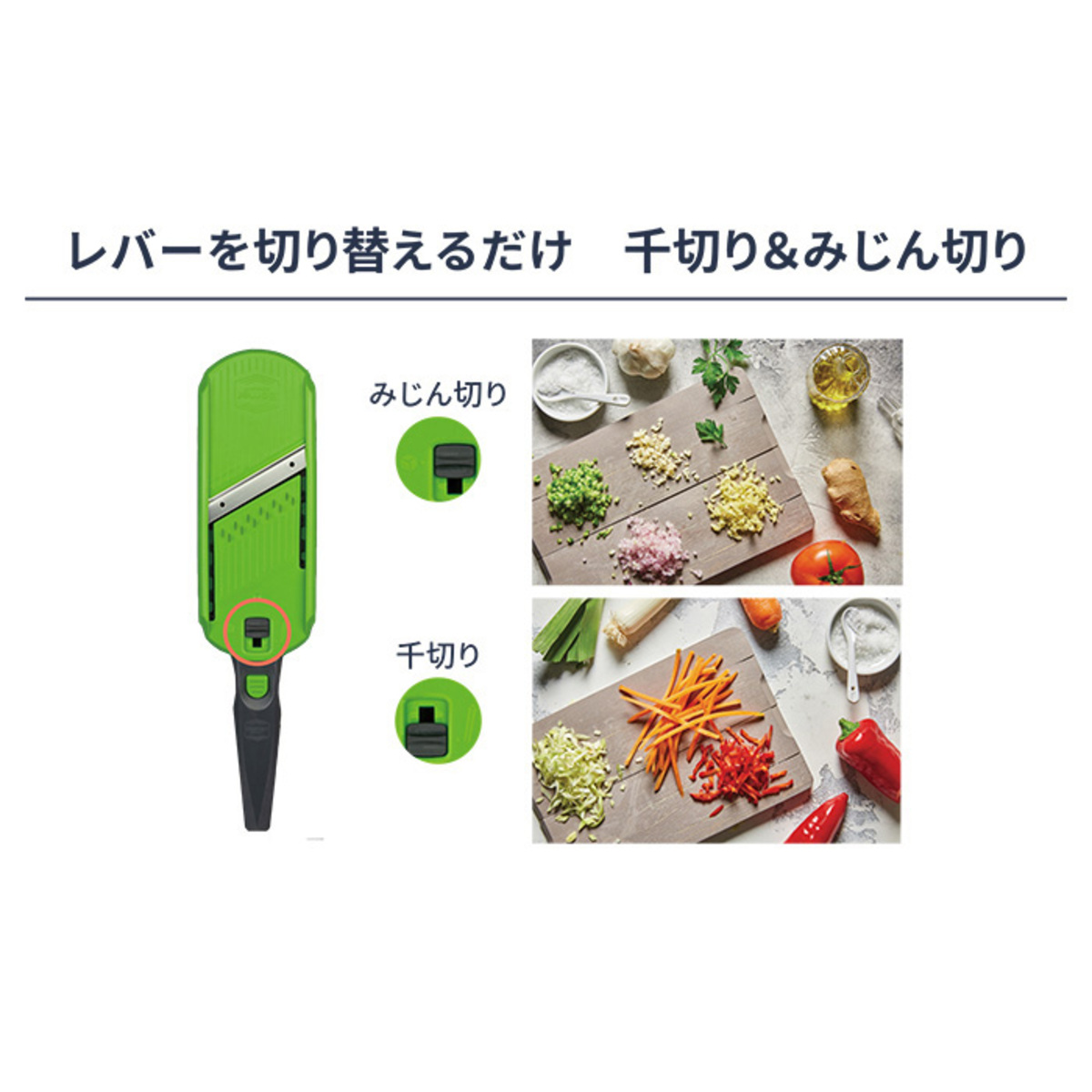 ベルナーのマルチダイサー。シンプルなレバー操作で千切りとみじん切りの2種類のカットができます