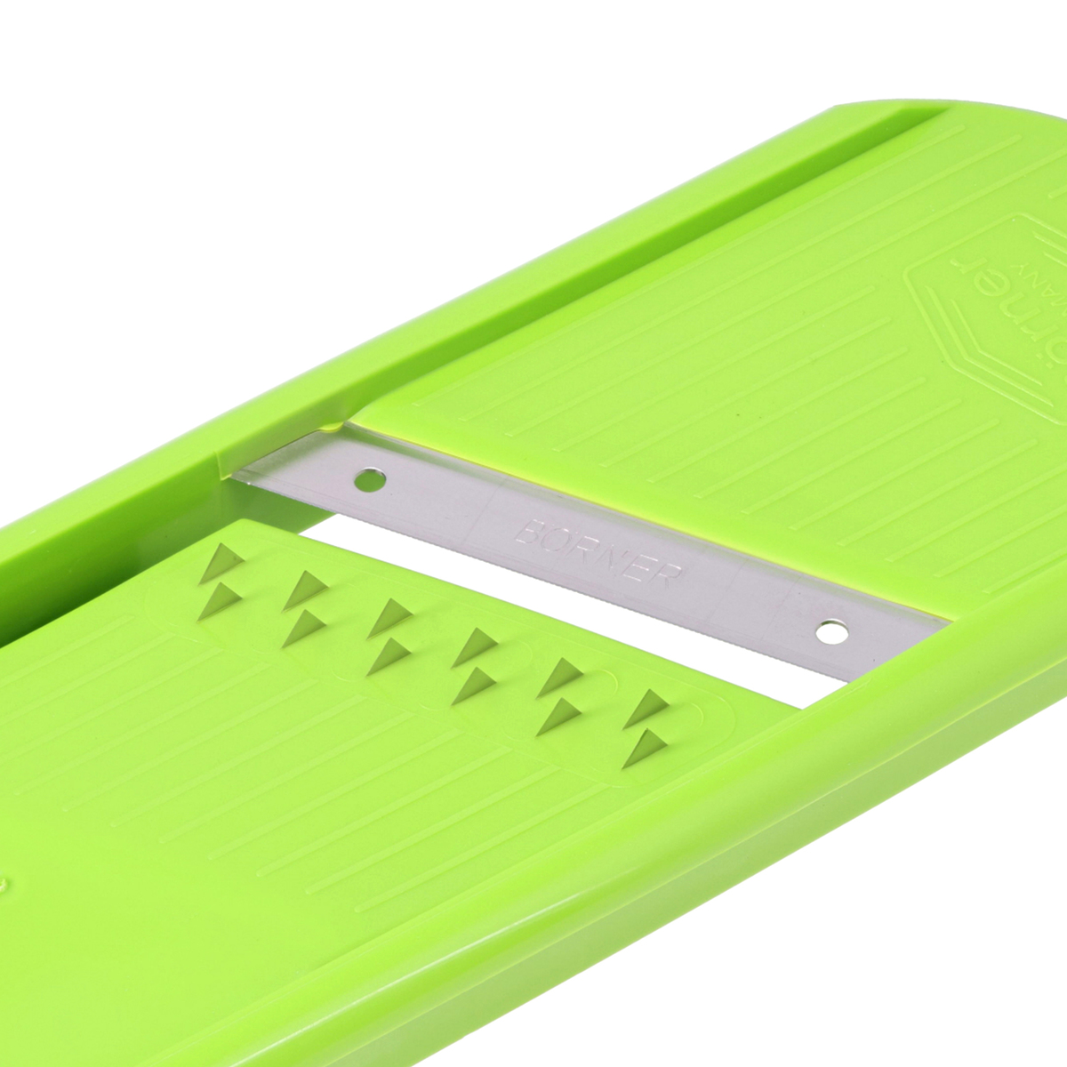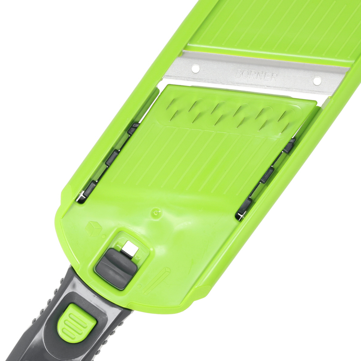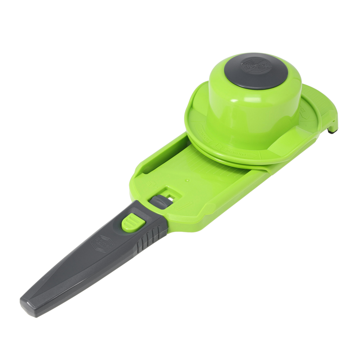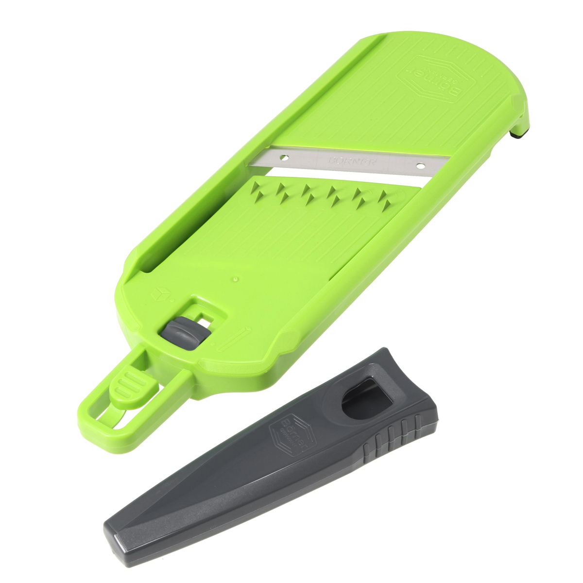 [商品内容] ・本体 ・安全ホルダー ・ガイドツール [サイズ] 本体:7.5x31x2.5cm 安全ホルダー:直径10.5x5cm ガイドツール10x8x5cm [重量(約)] 本体:105g 安全ホルダー:61g ガイドツール:30g [材質] 本体:ポリプロピレン 刃:ステンレススチール [使用方法] ・持ち手になるグリップは取り外し可能なタイプです ・安全ホルダーのスチールバーに野菜や果物を刺します。持ち上がったボタンを押しながらスライスします <千切りカッター(レバーを下にする)> ・ガイドツールに好みの野菜を入れ安全ホルダーをセットしスライスすると、にんじんや、きゅうり、ピーマンなどの野菜4mmの厚さにカット出来ます <マルチダイサー(微塵切り)(レバーを上にする)> ・スライスするごとに安全ホルダーを90度回転させると、微塵切りが出来ます [注意事項] ※取っ手取り外し可 ※使用不可:食器洗い機 ※スライサーは鋭利な刃物です、ご使用の際には十分にご注意ください ※プラスチック部分のみ手が触れるようにし、決して刃には触れないでください ※お子様が触れたり、おもちゃにする事の無いようにご注意ください ※素手でのご使用は事故やケガの原因となりますので、安全ホルダーのご使用を推奨しております ※キッチンブラシなどを使い、流水で洗ってください ※刃には絶対に触れないでください ※洗浄後、水が切れてから保管してください 【ドイツ製】