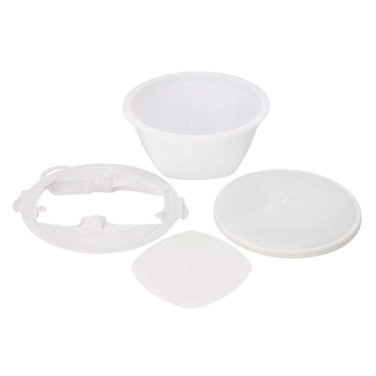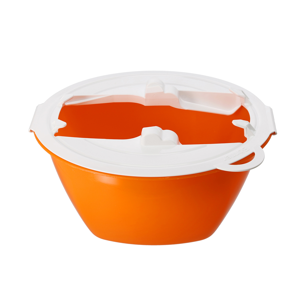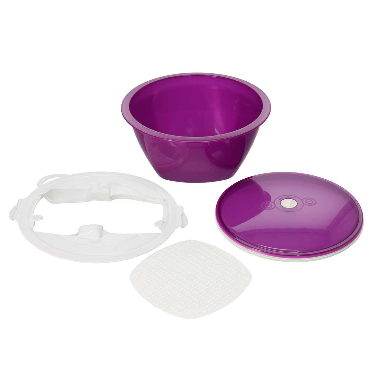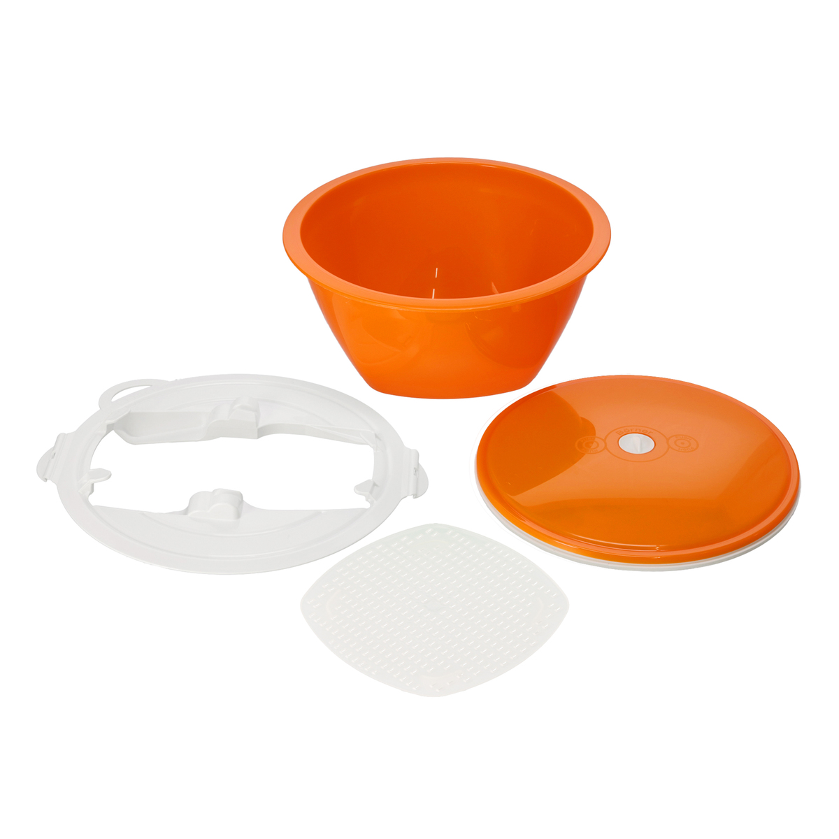 [商品内容] ・ボウル ・水切りすのこ ・マルチプレート ・蓋 [サイズ] 直径27x13cm [重量] 約580g [材質] ABS樹脂 [使用方法] ・ボウルにマルチプレートを置くと、別売りのV5スライサーがセットできます ・マルチプレートはボウルにしっかりとロックでき、ボウルはゴム製の滑り止め脚が付いています ・付属のすのこを入れれば、果物や野菜の水を切ることができます ・蓋は、PUSHの位置を軽く押して空気を抜くことで固定されずれにくくなります(蓋がずれない状態が2時間程度持続しますが、長時間ロックされるような仕様ではありません) ・蓋を外す際は中央のシリコン弁を倒してください。空気が入りと固定が解除され簡単に外すことができます [注意事項] ※使用不可:食器洗い機 ※使用可:電子レンジ(ボウルと蓋のみ) ※お子様が触れたり、おもちゃにする事が無いようにご注意ください ※電子レンジで使用する場合は、蓋についた白いパッキンと弁、ボウルに敷かれたすのこは取り外してください 【ドイツ製】