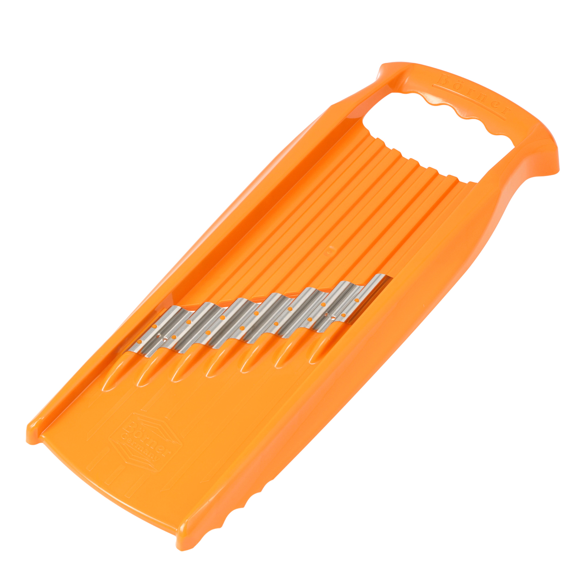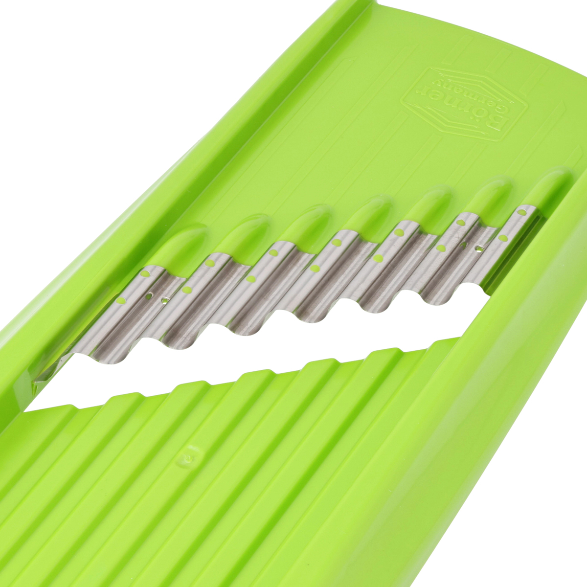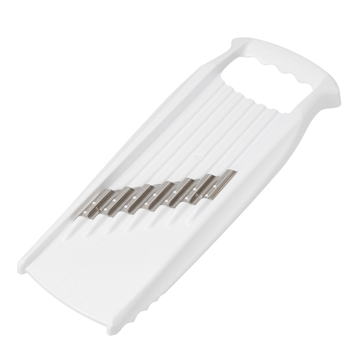 [サイズ] 13x34x3.5cm [重量] 約150g [材質] 本体:ABS樹脂 刃:ステンレススチール [使用方法] 上下に食材を動かすだけで波型の刃がウェーブカットになります。さらに、ウェーブカットした食材を全て重ね、90度回して横からもう一度スライスすると、スパイラルヌードルができます。食材を一回毎に90度回転させながらスライスすると、ワッフルカットになります [お手入れ] ・キッチンブラシなどを使い、流水で洗ってください ・刃には絶対に触れないでください ・洗浄後、水が切れてから保管してください [注意事項] ※使用不可:食器洗い機 ※スライサーは鋭利な刃物です。ご使用の際には十分にご注意ください ※プラスチック部分のみ手が触れるようにし、決して刃には触れないでください ※お子様が触れたり、おもちゃにする事のないようご注意ください ※素手でのご使用は事故やケガの原因となりますので、安全ホルダーのご使用を推奨しております 【ドイツ製】
