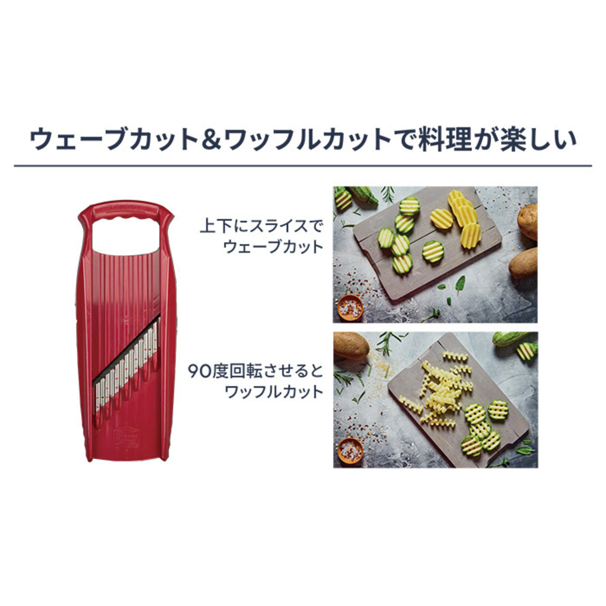 シンプルに上下に食材を動かすだけで、波型の刃がウェーブカットを実現。ウェーブカットした食材を全て重ね、90度回して横からもう一度スライスすると、スパイラルヌードルができます
