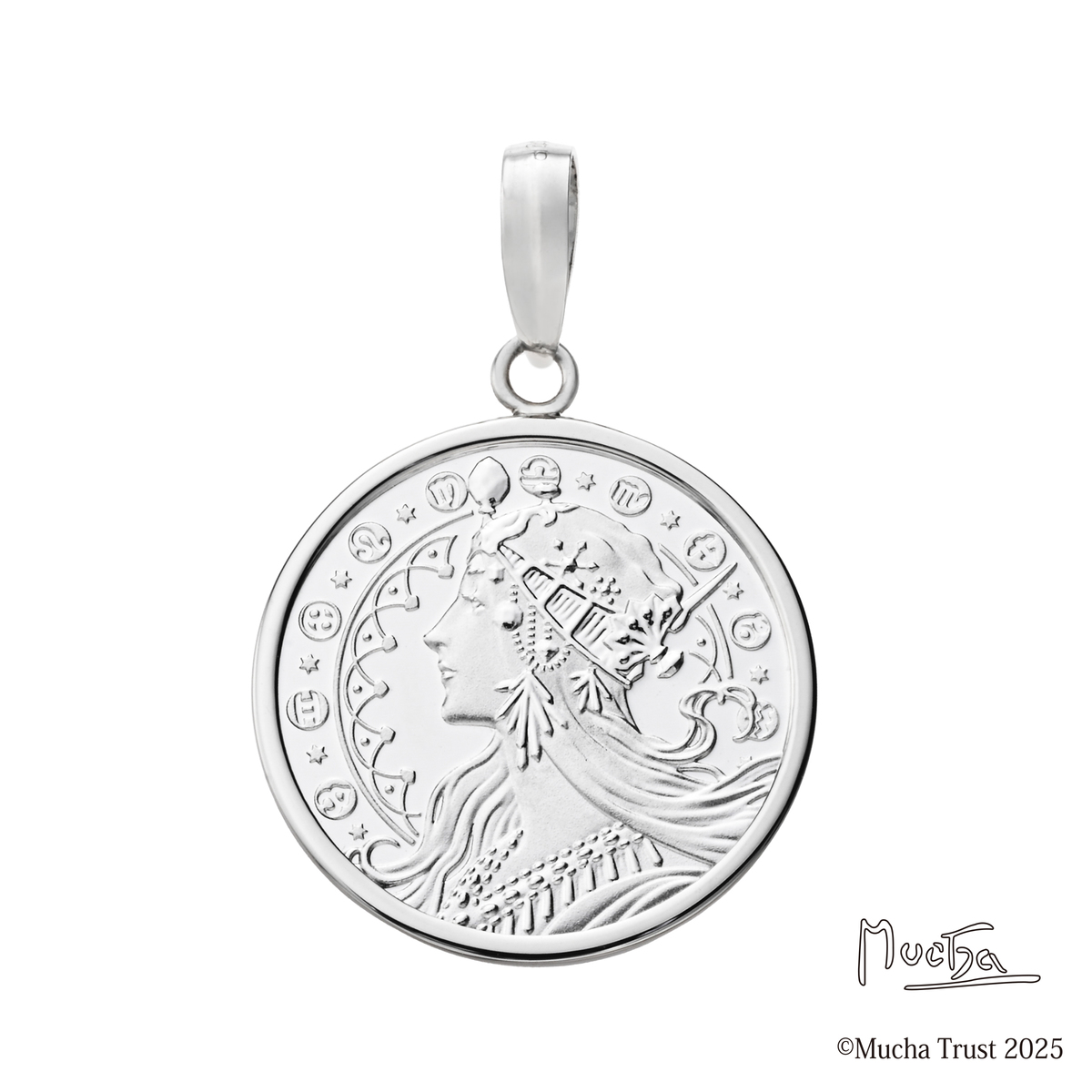 表面に横顔を見せる美しい女性を中心に12の星座が描かれており、裏面には、ミュシャの画家デビュー130周年を記念した特別なデザインが刻まれています。