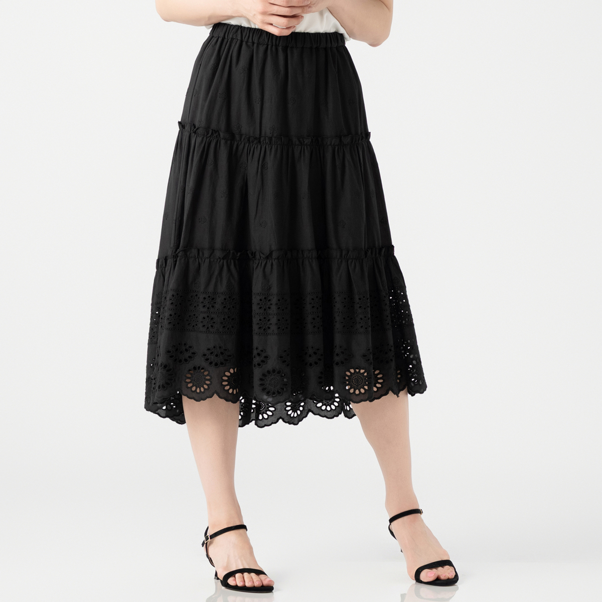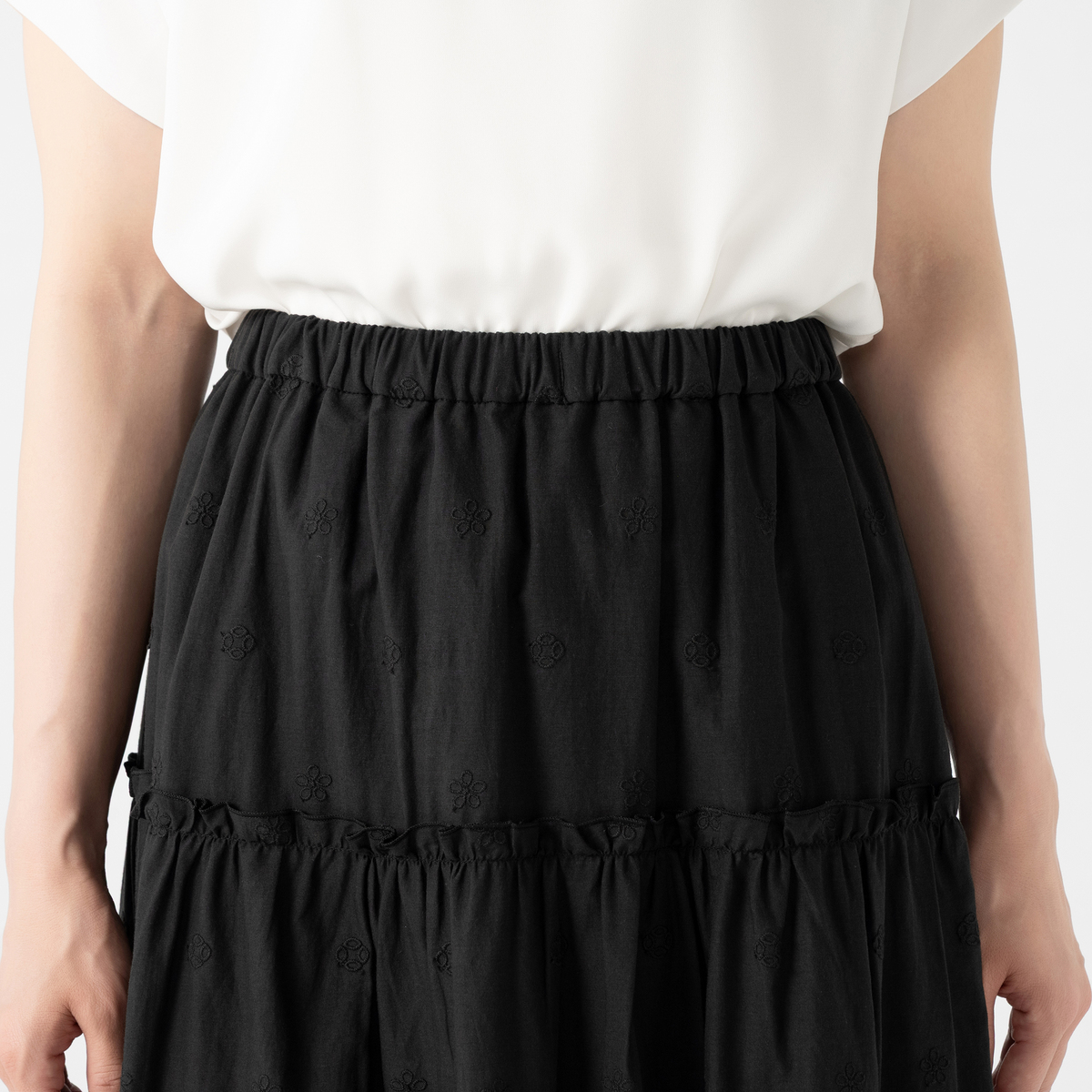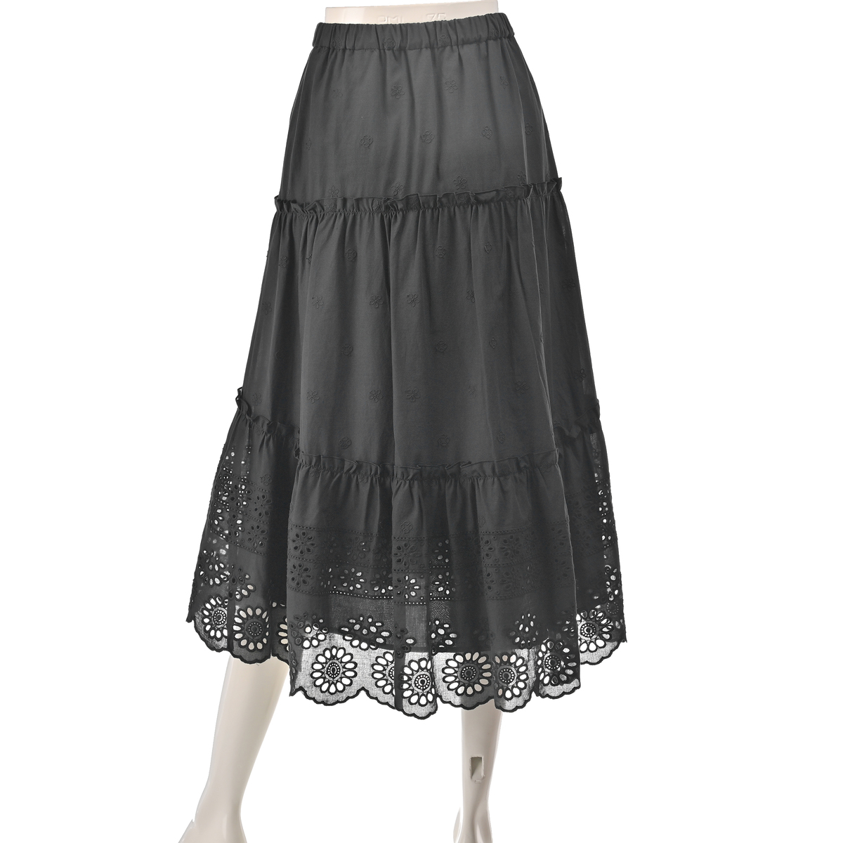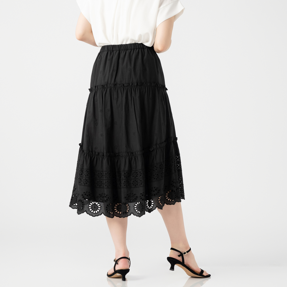 軽やかなコットンローン生地を使い、裾のスカラ刺繍と花柄のアイレット刺繍をパネル調に施したティアードスカートです。アイレット刺繍より上は小花を総柄のように刺繍。切り替えやギャザーもバランス良く設計し、大人可愛いシルエットを楽しめます