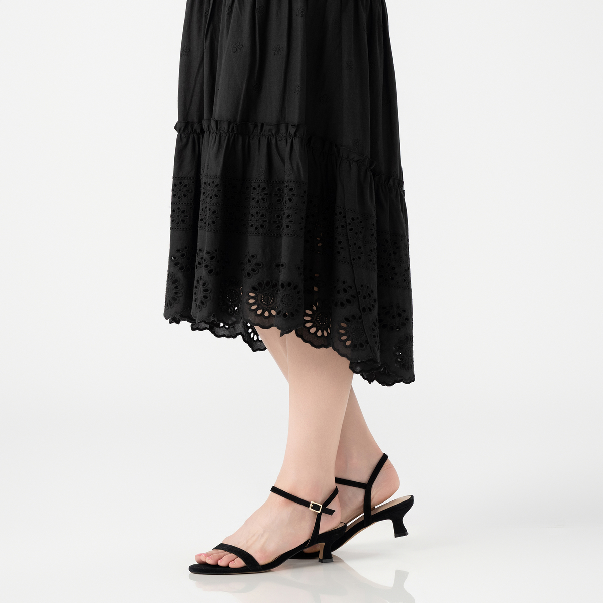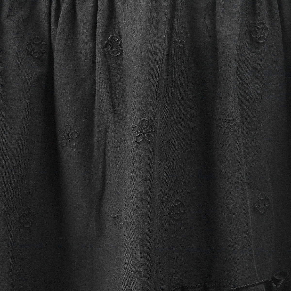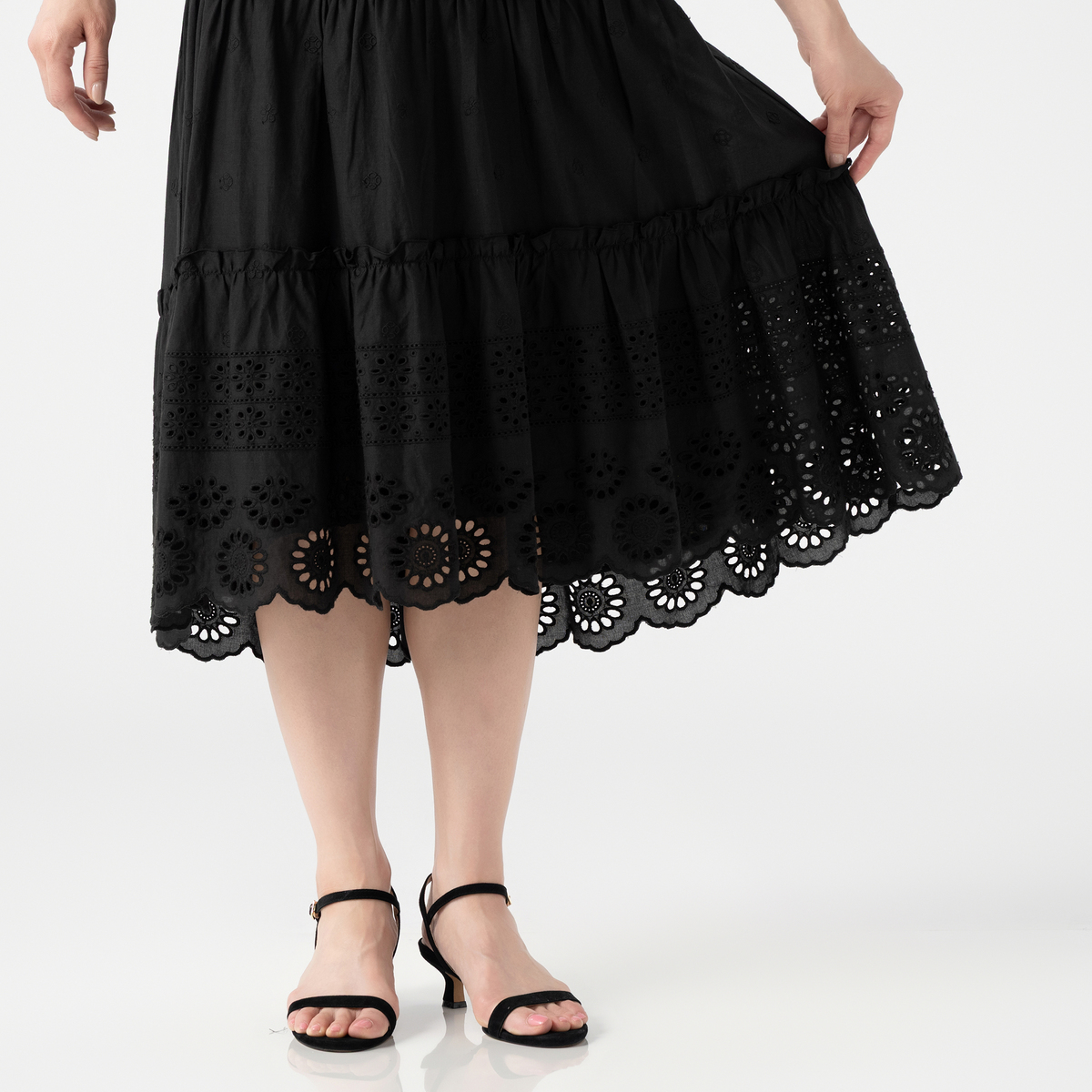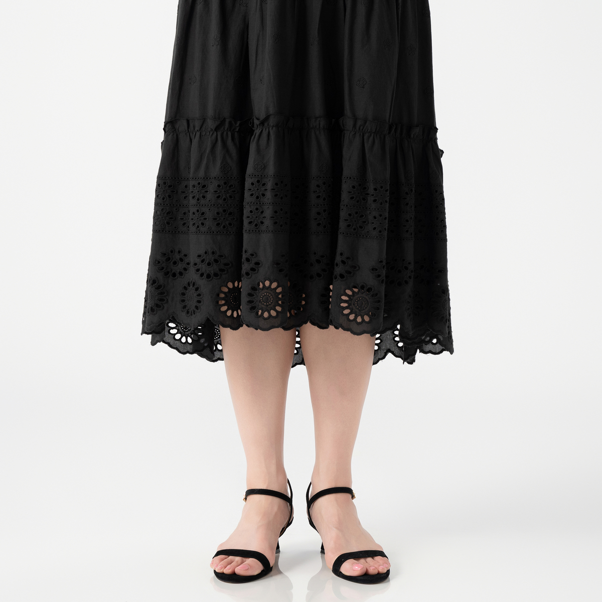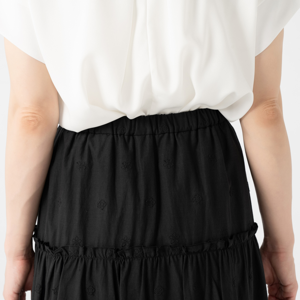 軽やかなコットンローン生地を使い、裾のスカラ刺繍と花柄のアイレット刺繍をパネル調に施したティアードスカートです。アイレット刺繍より上は小花を総柄のように刺繍。切り替えやギャザーもバランス良く設計し、大人可愛いシルエットを楽しめます