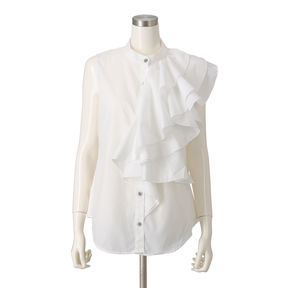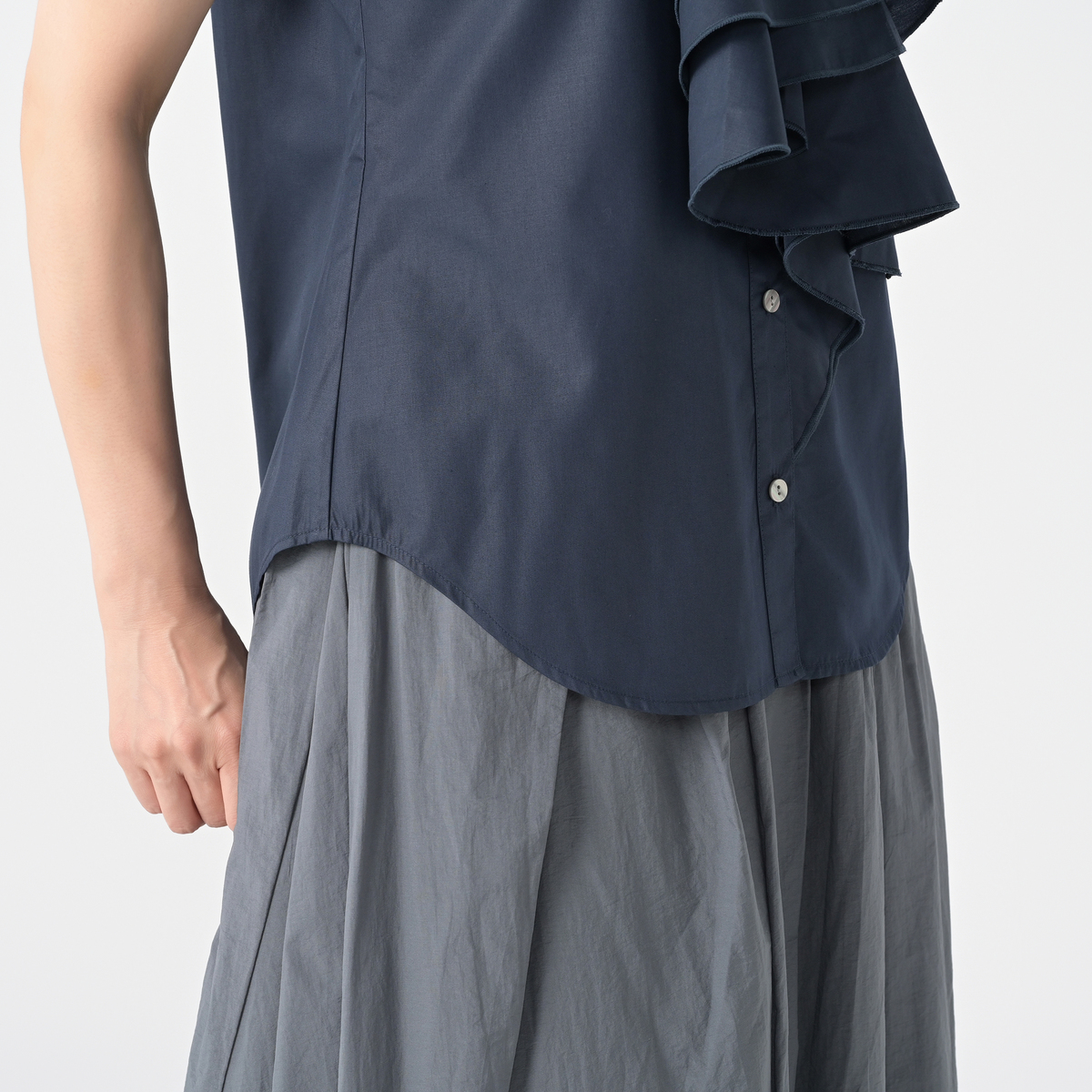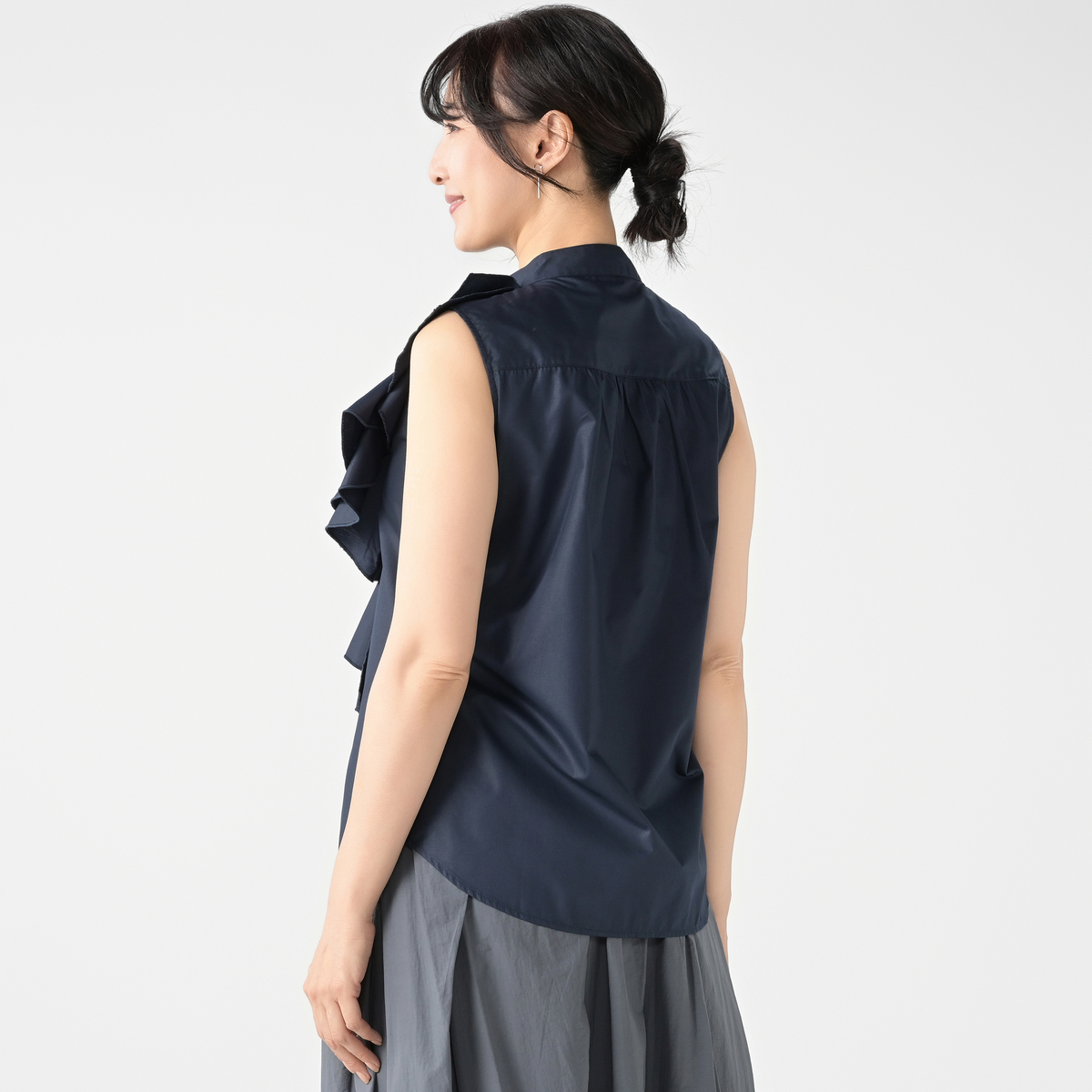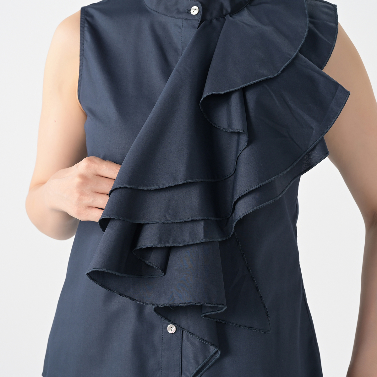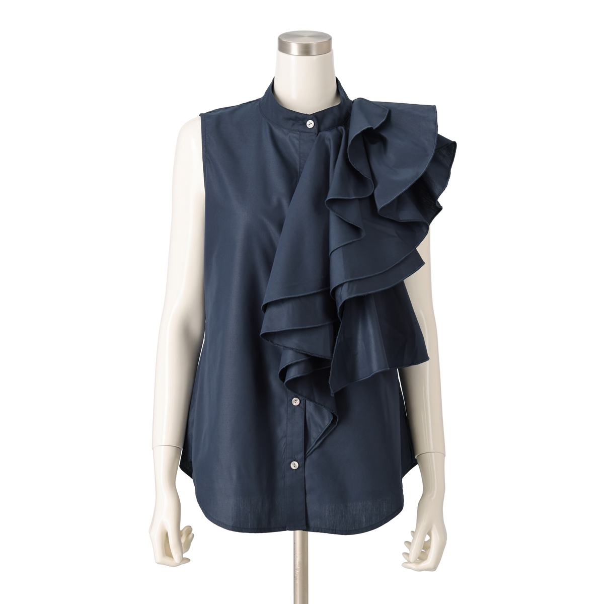 存在感あるアシンメトリーフリルが印象的なノースリーブブラウス。動きのあるフレアと繊細なメロウ始末がフェミニンさを引き立て、甘さを抑えたデザインで大人の装いに調和します