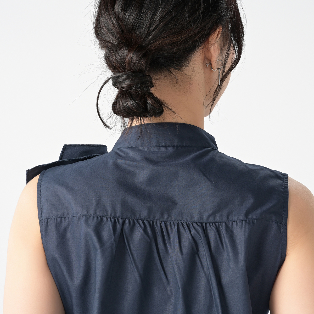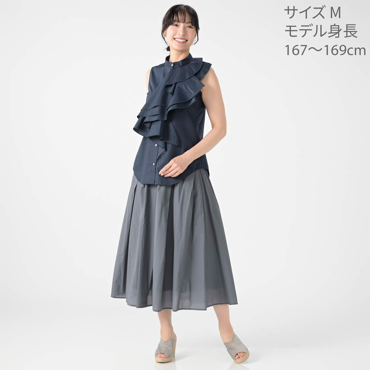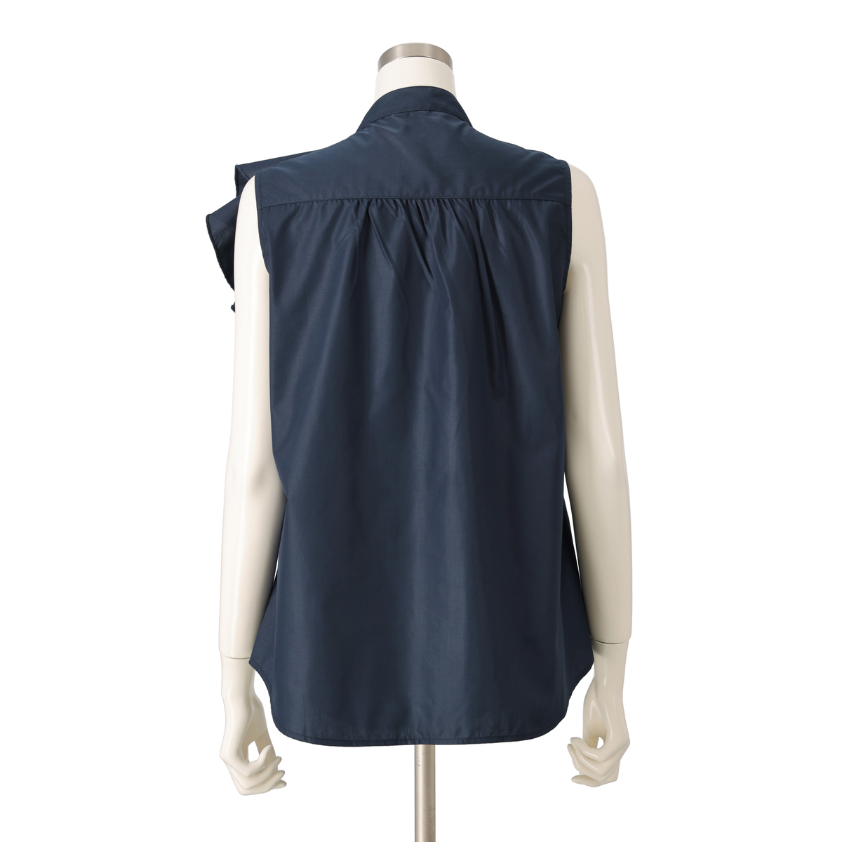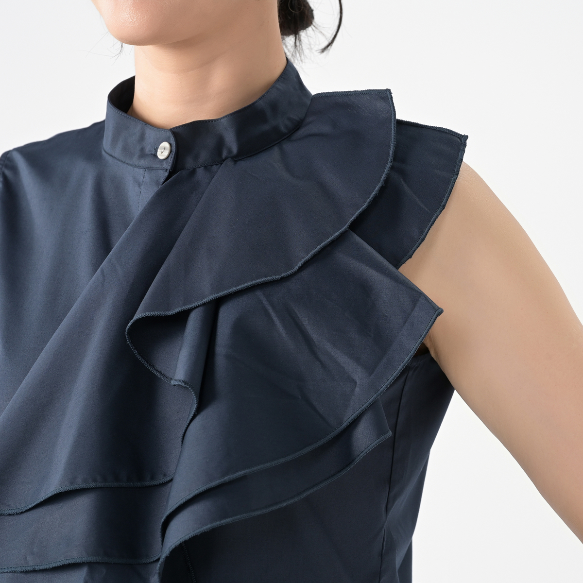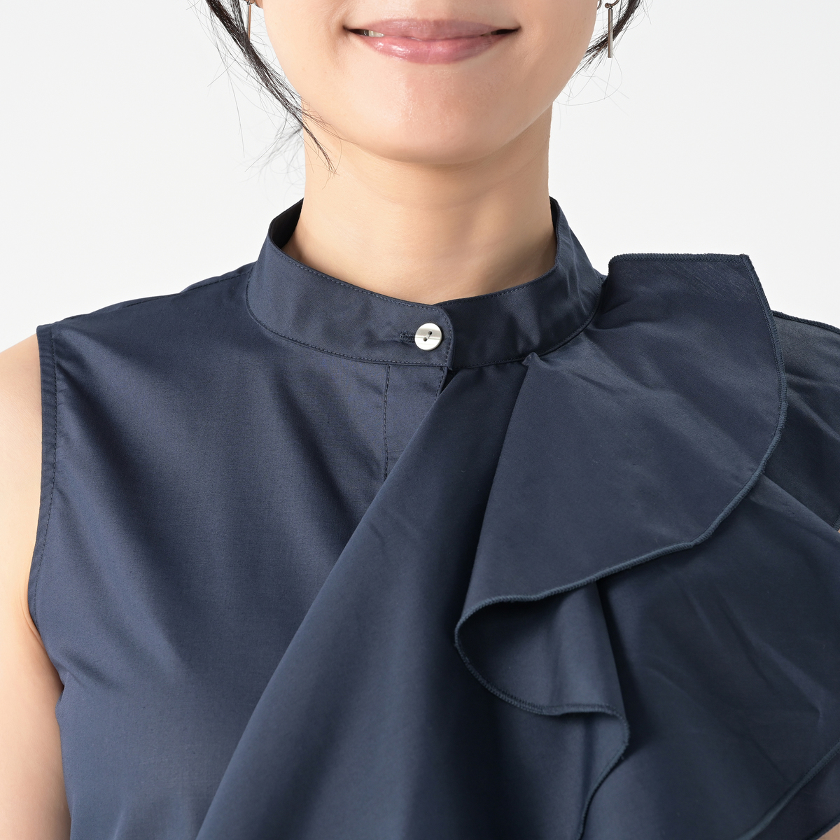 存在感あるアシンメトリーフリルが印象的なノースリーブブラウス。動きのあるフレアと繊細なメロウ始末がフェミニンさを引き立て、甘さを抑えたデザインで大人の装いに調和します