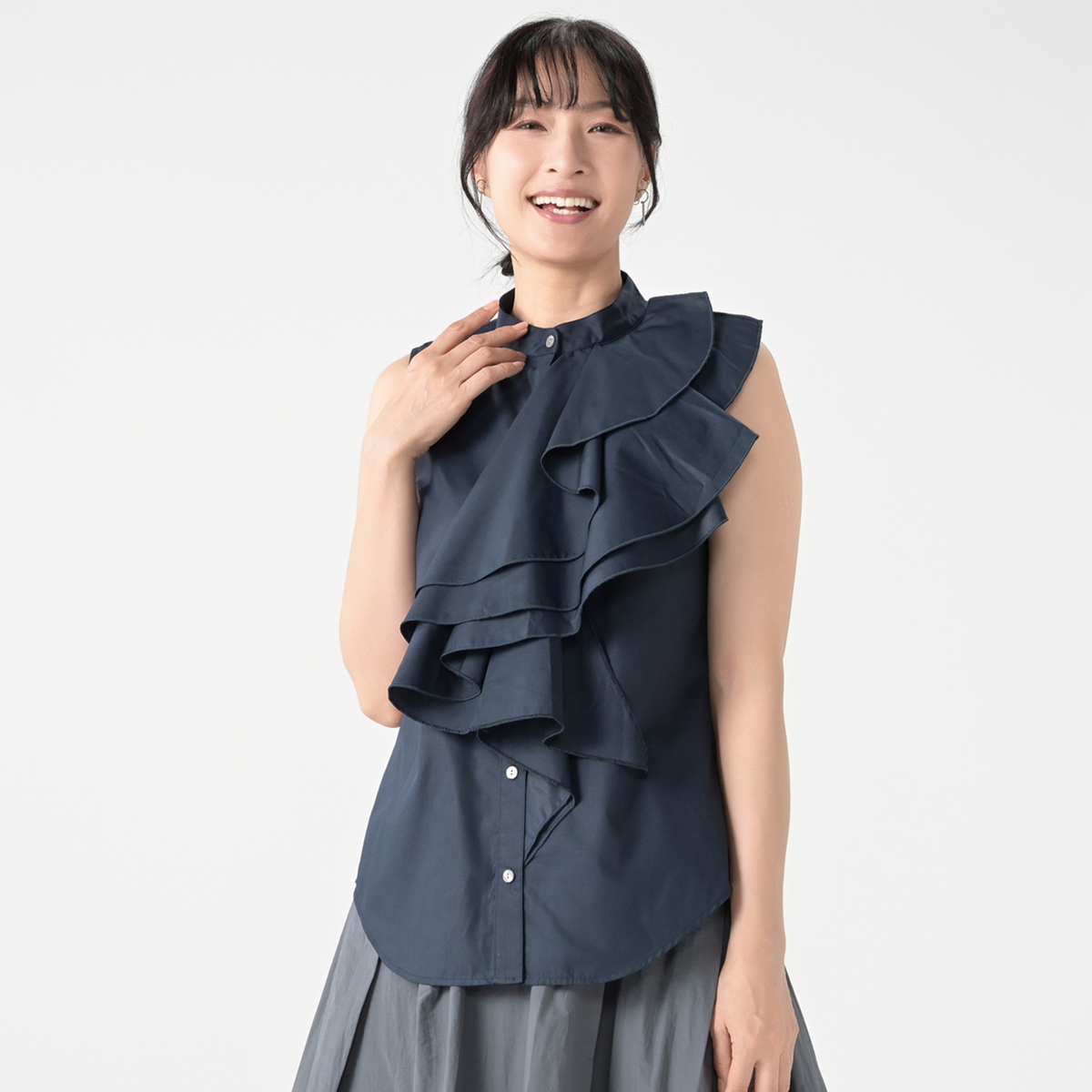 存在感あるアシンメトリーフリルが印象的なノースリーブブラウス。動きのあるフレアと繊細なメロウ始末がフェミニンさを引き立て、甘さを抑えたデザインで大人の装いに調和します