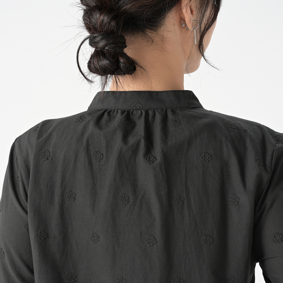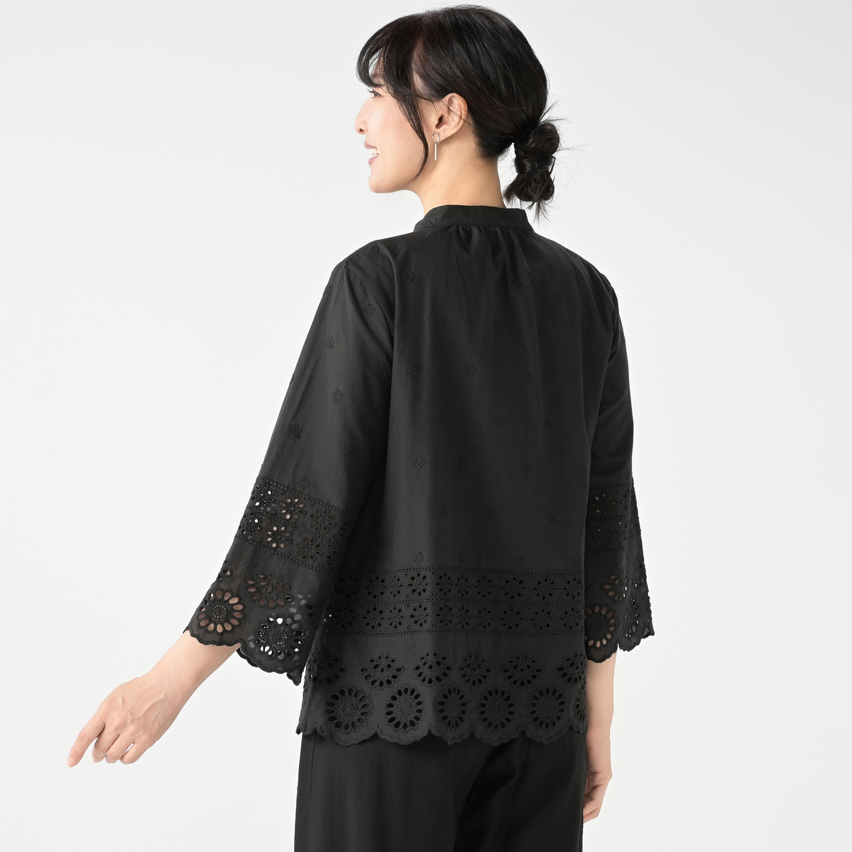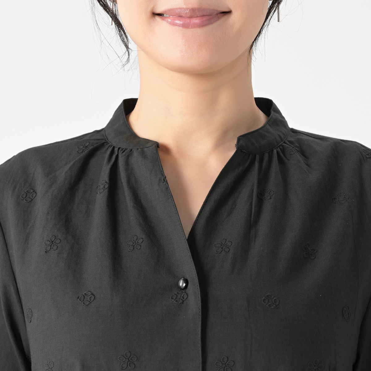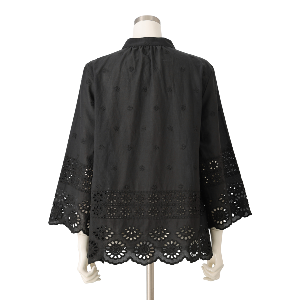 程よいハリ感と軽やかさのあるコットンローン生地に、立体感あふれる刺繍を施したブラウスです。裾と袖口端にはスカラ刺繍と花柄のアイレット刺繍をパネル調に。その上には小花を総柄のように刺繍し、上品な存在感に仕上げました