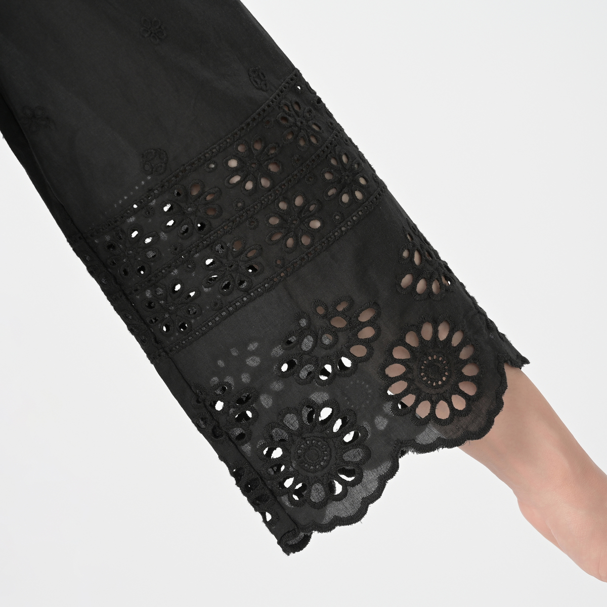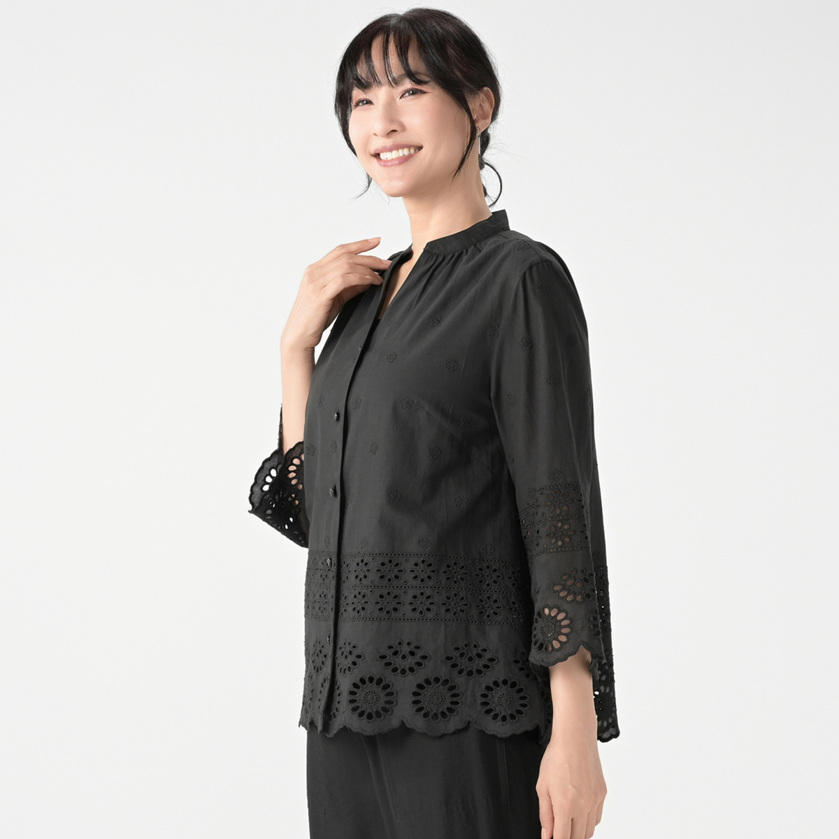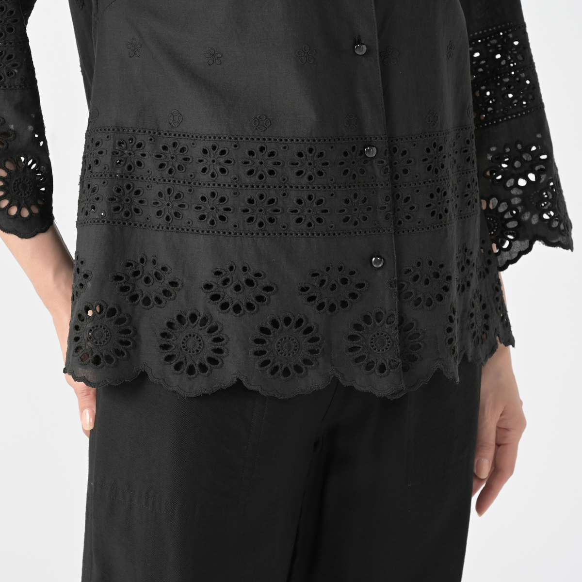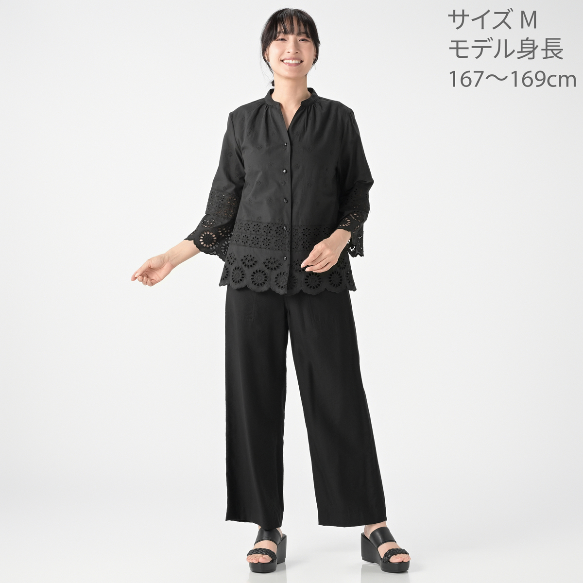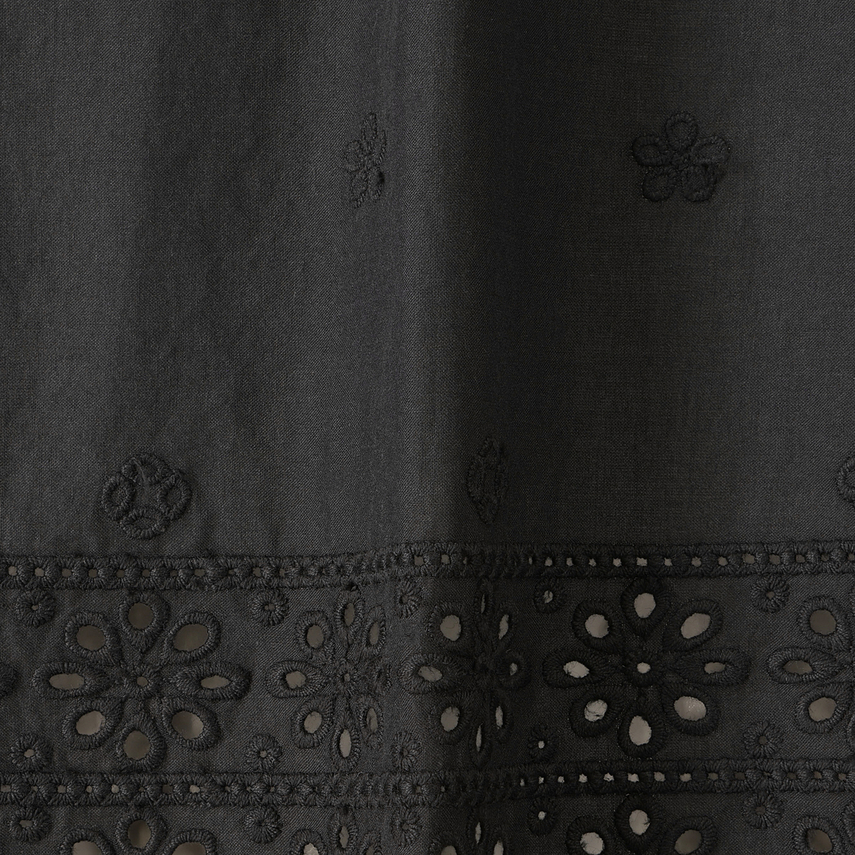 程よいハリ感と軽やかさのあるコットンローン生地に、立体感あふれる刺繍を施したブラウスです。裾と袖口端にはスカラ刺繍と花柄のアイレット刺繍をパネル調に。その上には小花を総柄のように刺繍し、上品な存在感に仕上げました