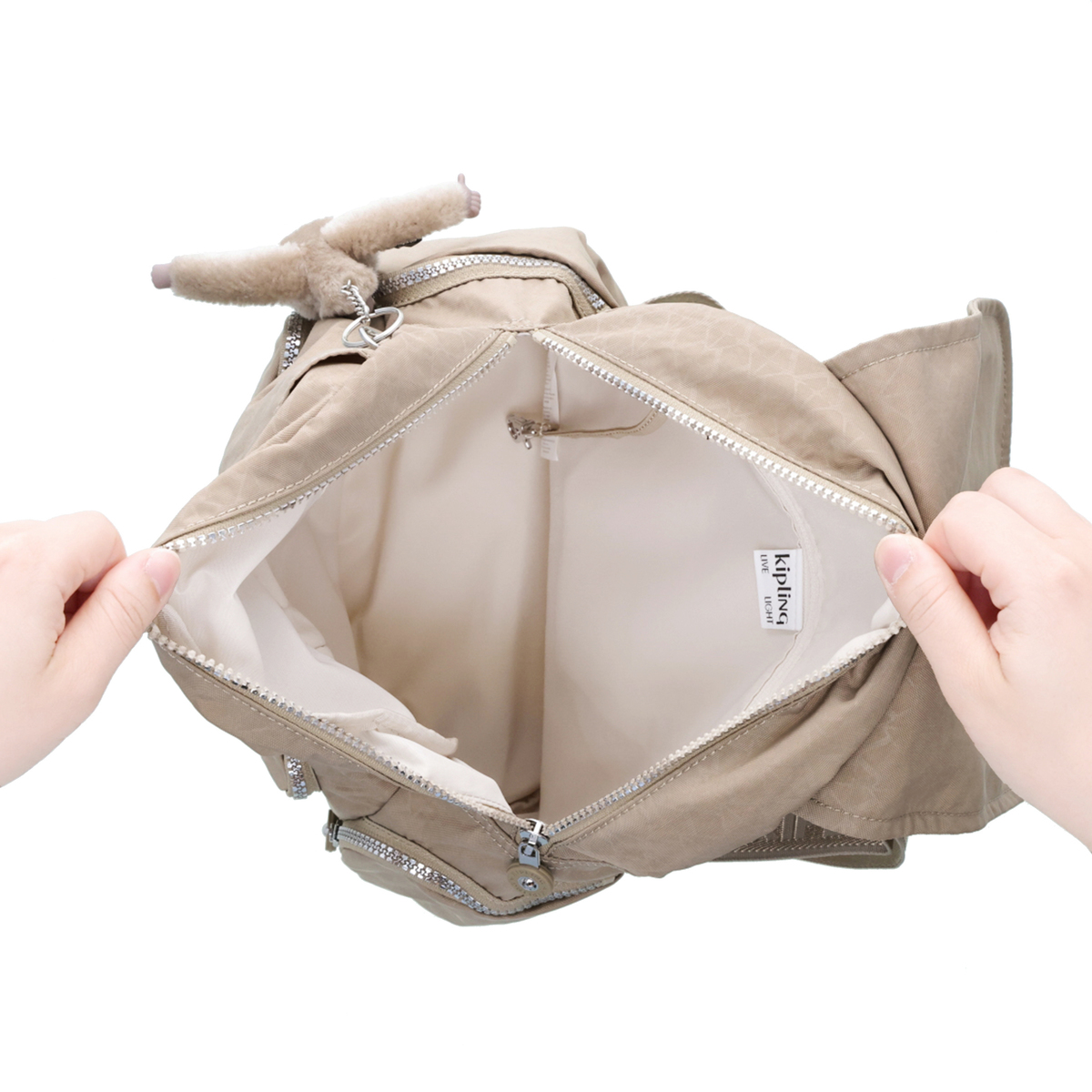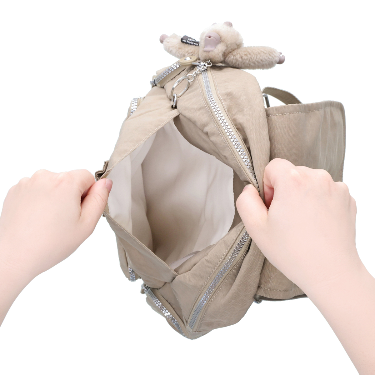 [サイズ(約)] 縦33.5×横27×マチ19cm ショルダーベルト長さ:46〜84cm [その他サイズ(約)]ハンドル立ち上り9cm [重量(約)]※付属品含む 470g [素材] ナイロン ※裏地有 [仕様] 付属(取り外し可):チャーム×1 開閉:かぶせ蓋マグネット+ファスナー式 底ビョウ:無 [ポケット] 内側:ファスナーポケット×1、オープンポケット×1、ペン挿し×2、キーフック×1 外側:(前面)ファスナーポケット×1 オープンポケット×1(サイド)ファスナーポケット×2 (後面)ファスナーポケット×1 [注意事項] ※直射日光や蛍光灯の影響で変色することがありますのでご了承ください 【インドネシア製】