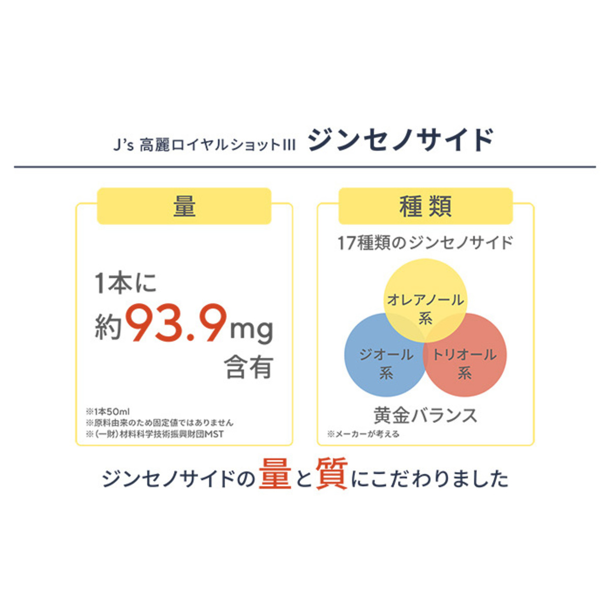 高麗人参には沢山の種類のサポニンが存在しており、高麗人参特有のサポニンがジンセノサイド(ギンセノシド)。本品はジンセノサイド(ギンセノシド)17種類含有で、1本50mlに約93.9mg含有(*1)。ジオール系、トリオール系、オレアノール系のサポニンがバランス良く含有されています
