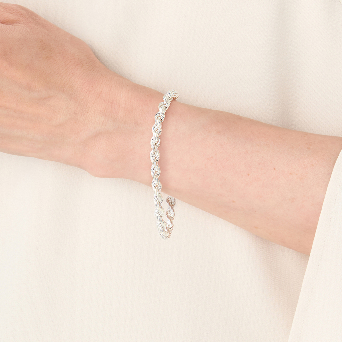 シルバー925を使用した美しいブレスレット。シルバーの上品な輝きと規則的に編み込まれたロープのデザインが手元を優雅に演出してくれます