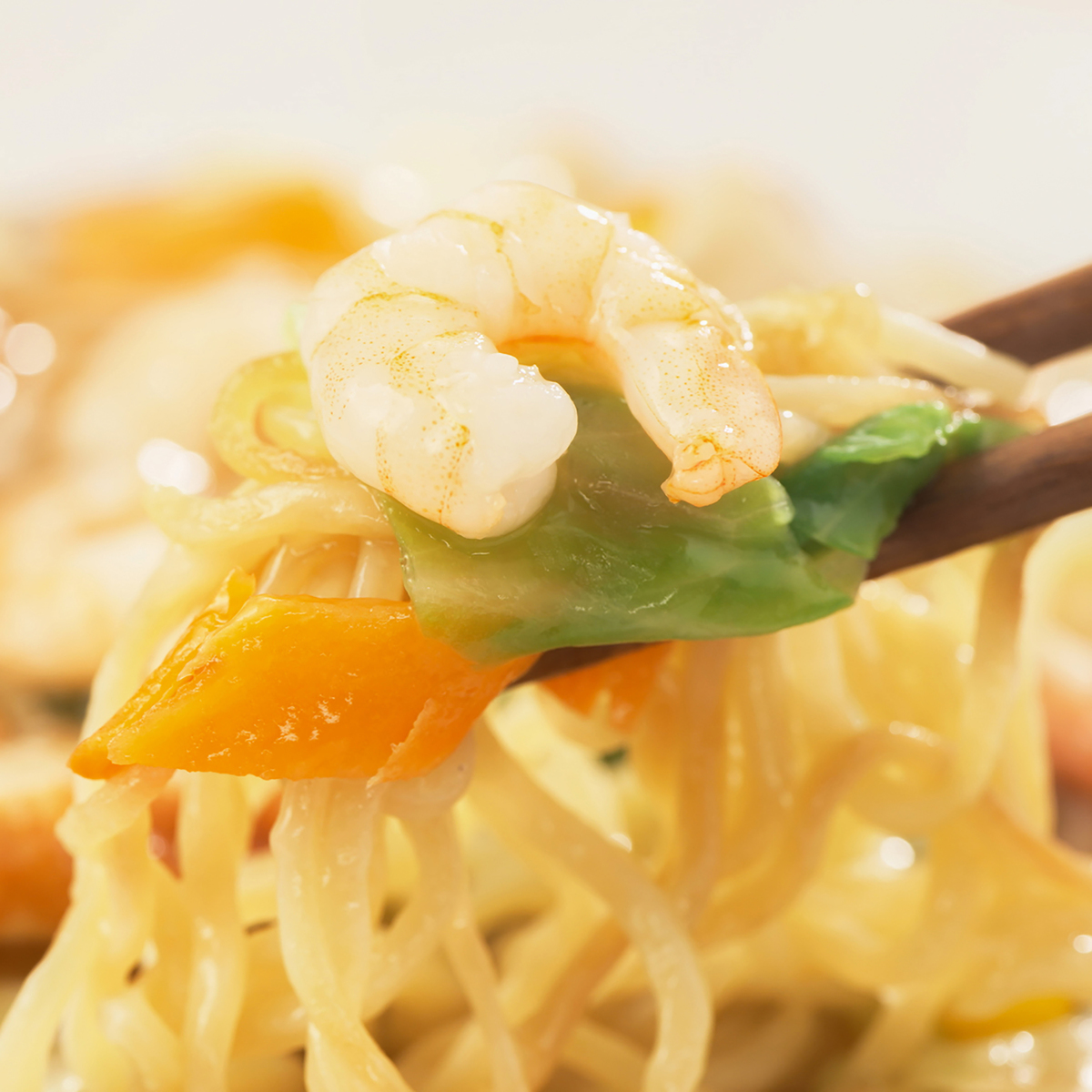 麺はリンガーハットの工場でつくった中太のストレート麺。電子レンジで加熱してフライパンで炒めることで、外側はパリパリ内側はモチモチの食感を楽しめます。餡は、ベースのポークエキス、チキンエキスにホタテエキスを加えることで、コク深い味に仕上げています