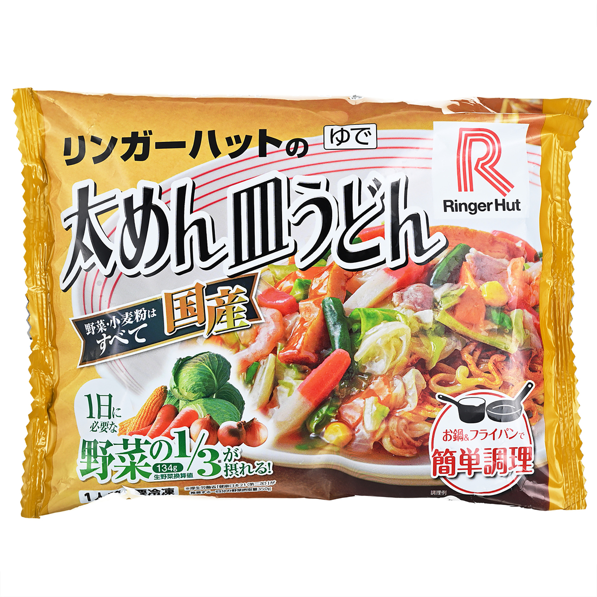 9種類の具材(キャベツ、玉ねぎ、にんじん、いんげん、コーン、揚げかまぼこ、豚肉、はんぺん、えび)が楽しめるリンガーハット「太めん皿うどん」。具材の野菜5種類と小麦粉は国産です