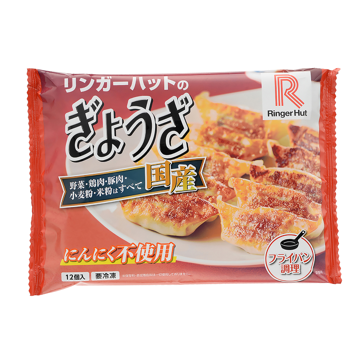 にんにく不使用。国産野菜(キャベツ、玉ねぎ、ネギ、ニラ)、豚肉・鶏肉、小麦粉、米粉も国産を使用。メーカー基準で"薄皮"に仕上げた、パリッとサクサクした食感です