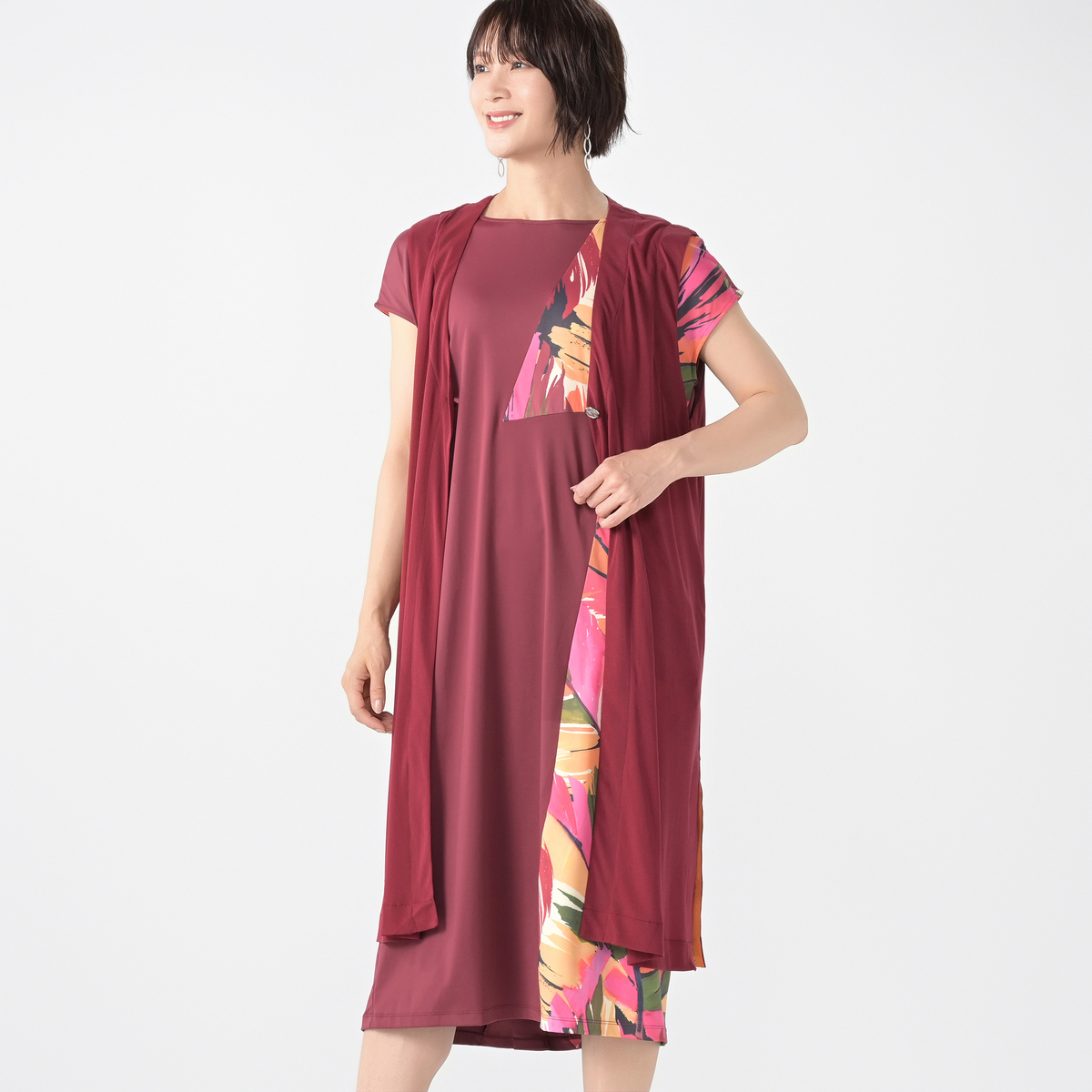 セールでしたので、2着購入。 赤い色のフェザーは派手だしなぁと思い見送ったのを今まさに後悔しているところです。 ワンピースの生地は水着やスポーツウェアの様な生地で厚手なのに涼しい。ツルツルとして着心地がとても良いです。 もう肌寒いので中に黒いタートルネックを着て、下はスパッツで過ごしてみましたが、とても過ごしやすくオシャレでした。 羽織りも肩のラインストーンがアクセントとして素敵だし、なにより軽くて手触りがいい。 もしかしたら、コレって猛暑の夏もイケるし、秋も下に着込んだら長く使えるのでは…あとこのスポーツウェアの生地だったら赤のフェザーは物凄く高級感があって今の時期映えるのでは?この値段なら三枚買った方が良かった?と今まさに悩んでいます。長く使える。応用が利く。間違いない。良い買い物をしました。