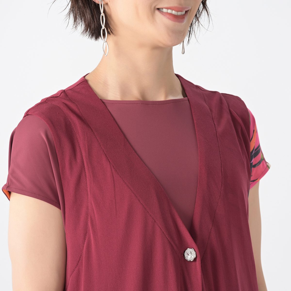 [セット内容] ・ワンピース ・ロングジレ ・ソックス <ワンピース> [商品寸法(ヌード)cm] サイズ バスト 着丈 S : 111(74〜82) 113 M : 116(79〜87) 113 L : 121(84〜92) 113 LL : 127(89〜97) 115 3L : 133(94〜102) 115 サイズ 裄丈 ウエスト ヒップ S : 33.5 (63〜69) (82〜88) M : 34 (66〜72) (85〜91) L : 34.5 (69〜75) (88〜94) LL : 35.5 (72〜78) (91〜97) 3L : 36 (75〜81) (94〜100) [素材]ポリエステル85%、ポリウレタン15% <ジレ> [商品寸法(ヌード)cm] サイズ バスト 着丈 S : 113(74〜82) 100 M : 118(79〜87) 100 L : 123(84〜92) 100 LL : 129(89〜97) 102 3L : 135(94〜102) 102 サイズ 肩幅 S : 41 M : 42 L : 43 LL : 44.5 3L : 46 [素材]ナイロン100% <ソックス> [対応サイズ] 22〜25cm [素材] ポリエステル40%、綿35%、ナイロン20%、ポリウレタン5% [お手入れ] 手洗い可 [注意事項] ※商品寸法の誤差は多少発生します。ご了承下さい ※洗濯後はすぐに脱水し、形を整えて干して下さい。長時間水につけたままにしないで下さい ※洗濯後は重ね置きしないで下さい ※もみ洗いはお避け下さい ※スチームアイロンを浮かしながら掛け、形を整えて下さい ※濃色物は、洗濯の際、色落ちすることがありますので他の物と分けて洗って下さい <ソックス> ※淡色製品には蛍光増白剤入り洗剤を使用しないで下さい 【中国製】