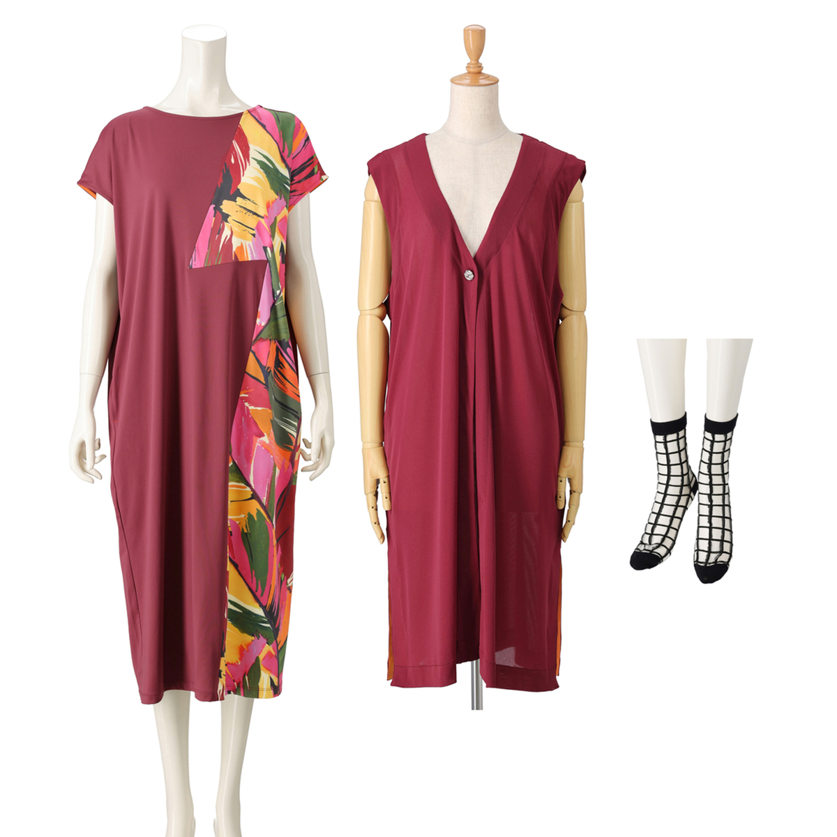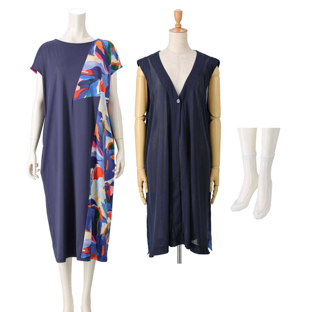 海辺をイメージした大胆なプリントのワンピース、涼しげなシアー素材のロングジレ、コーデをおしゃれに演出してくれるソックスの3点セットです