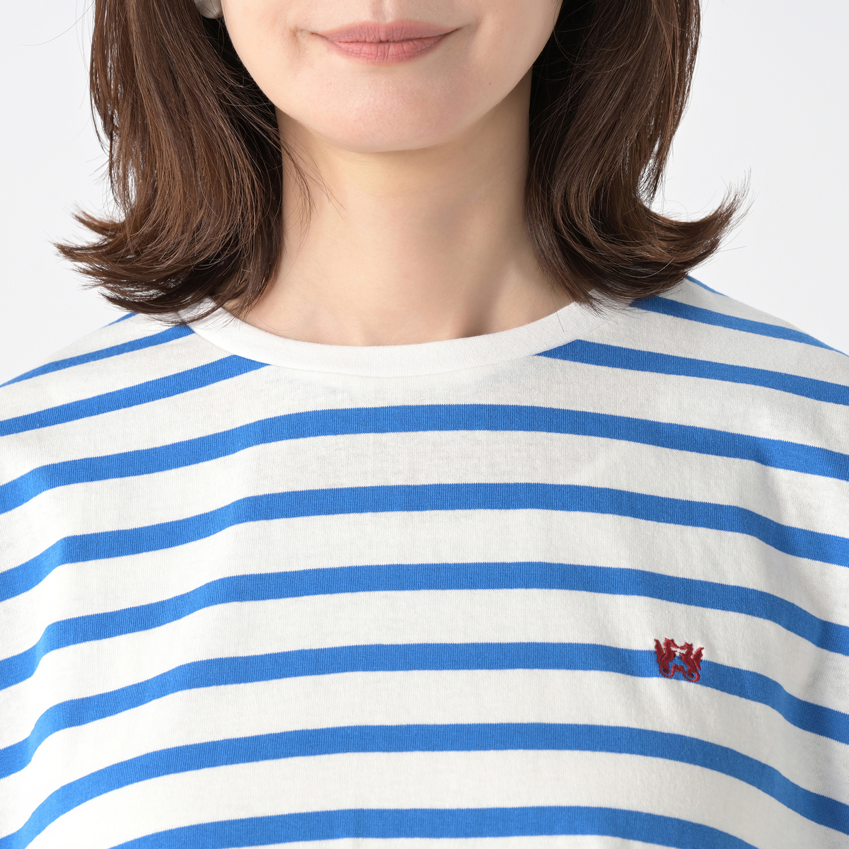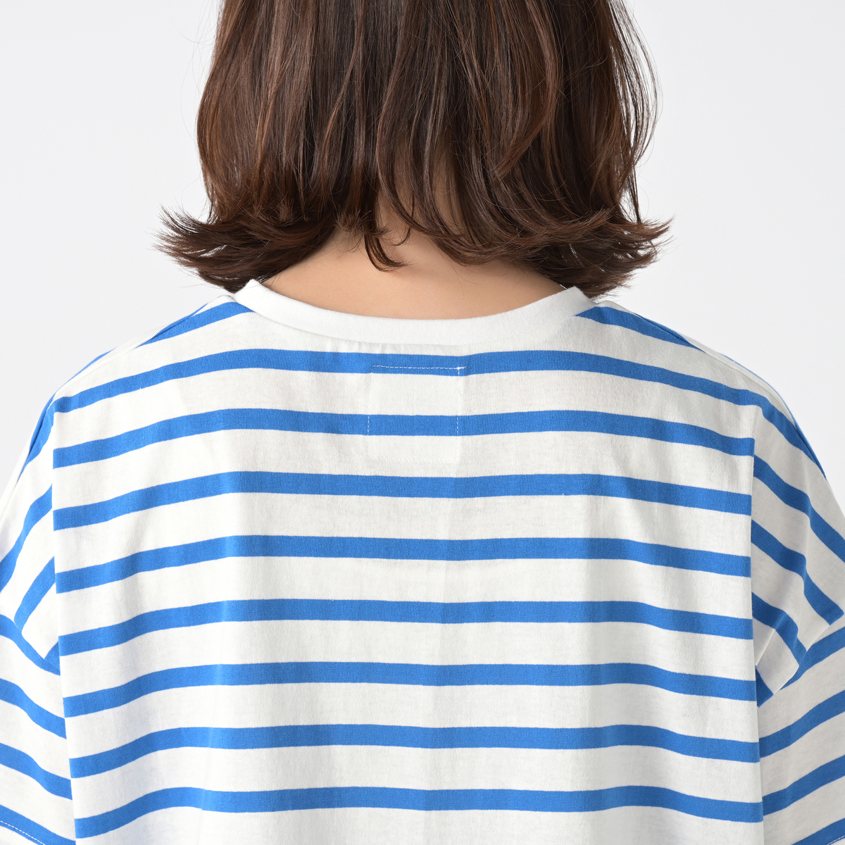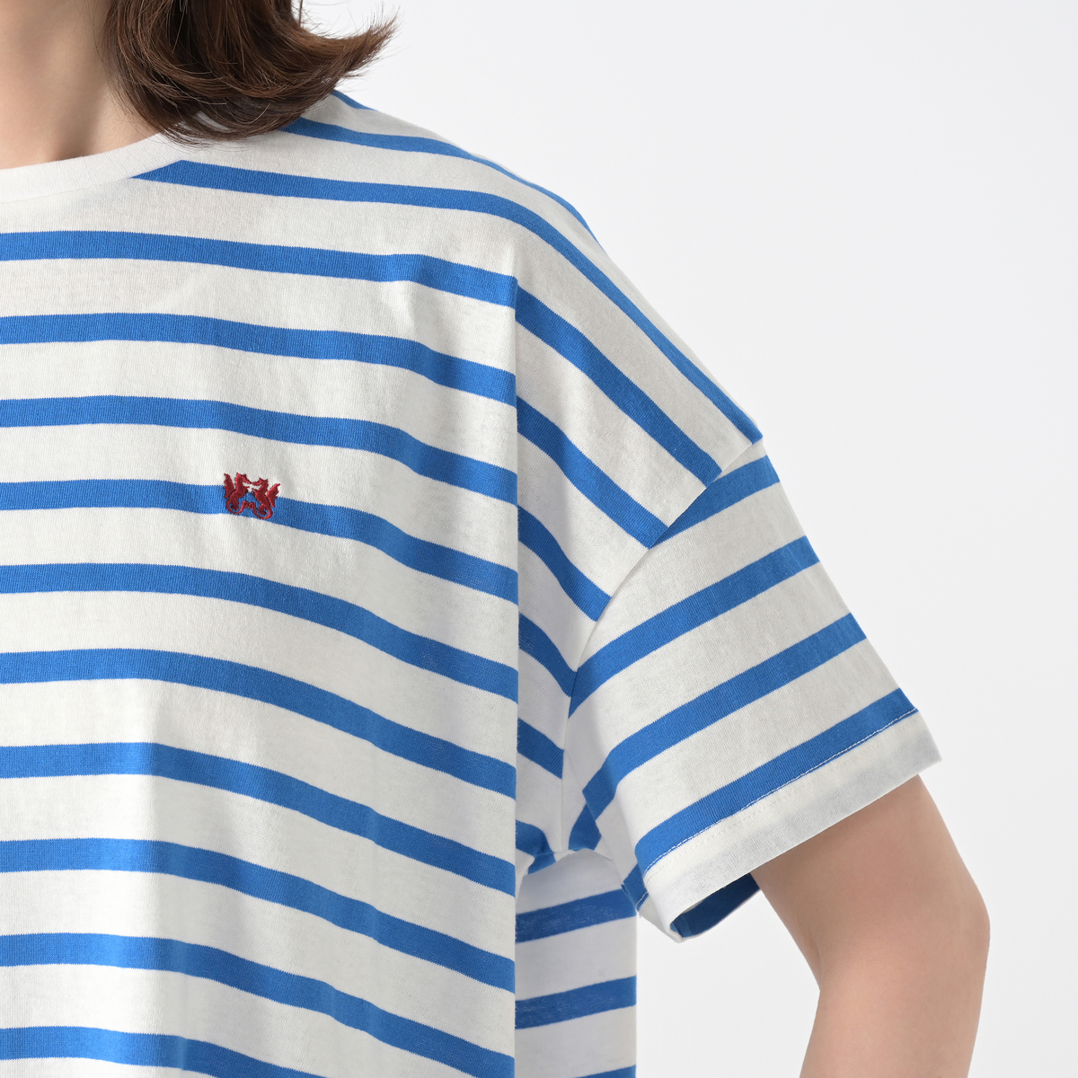 ボーダーと配色のドラゴン刺繍がポイントに。裾に向かってゆったりと広がるAラインのシルエットです。身幅をゆったりと取っているため風通しが良くなっています