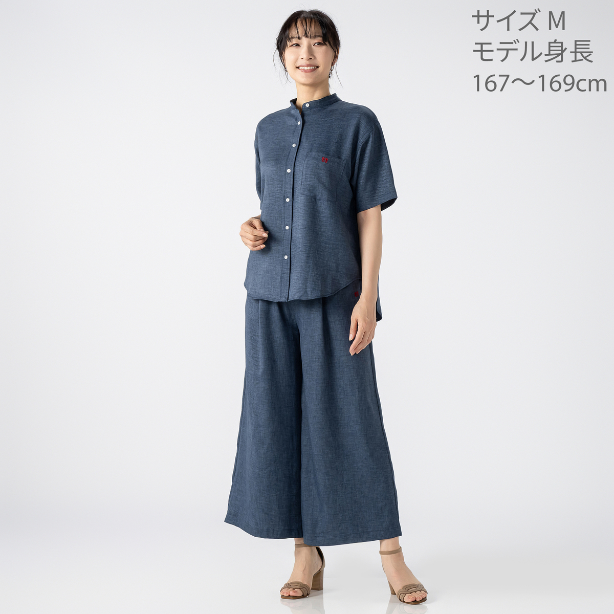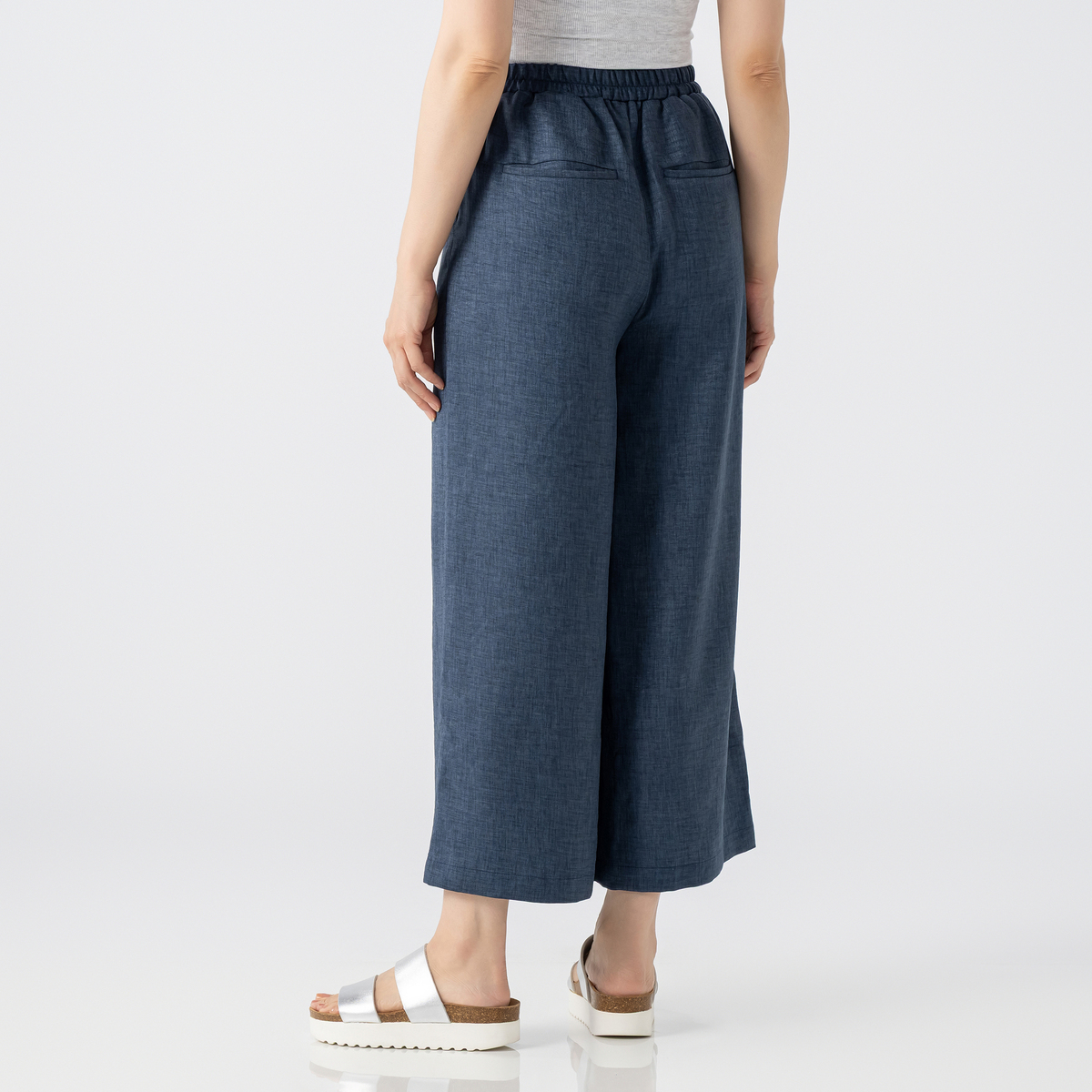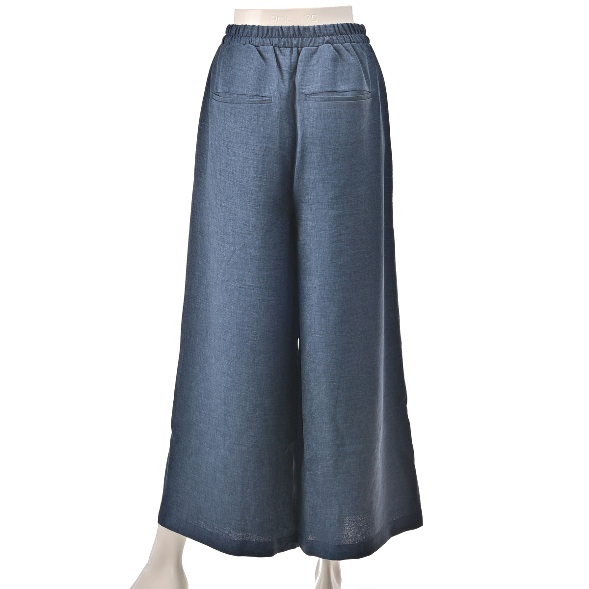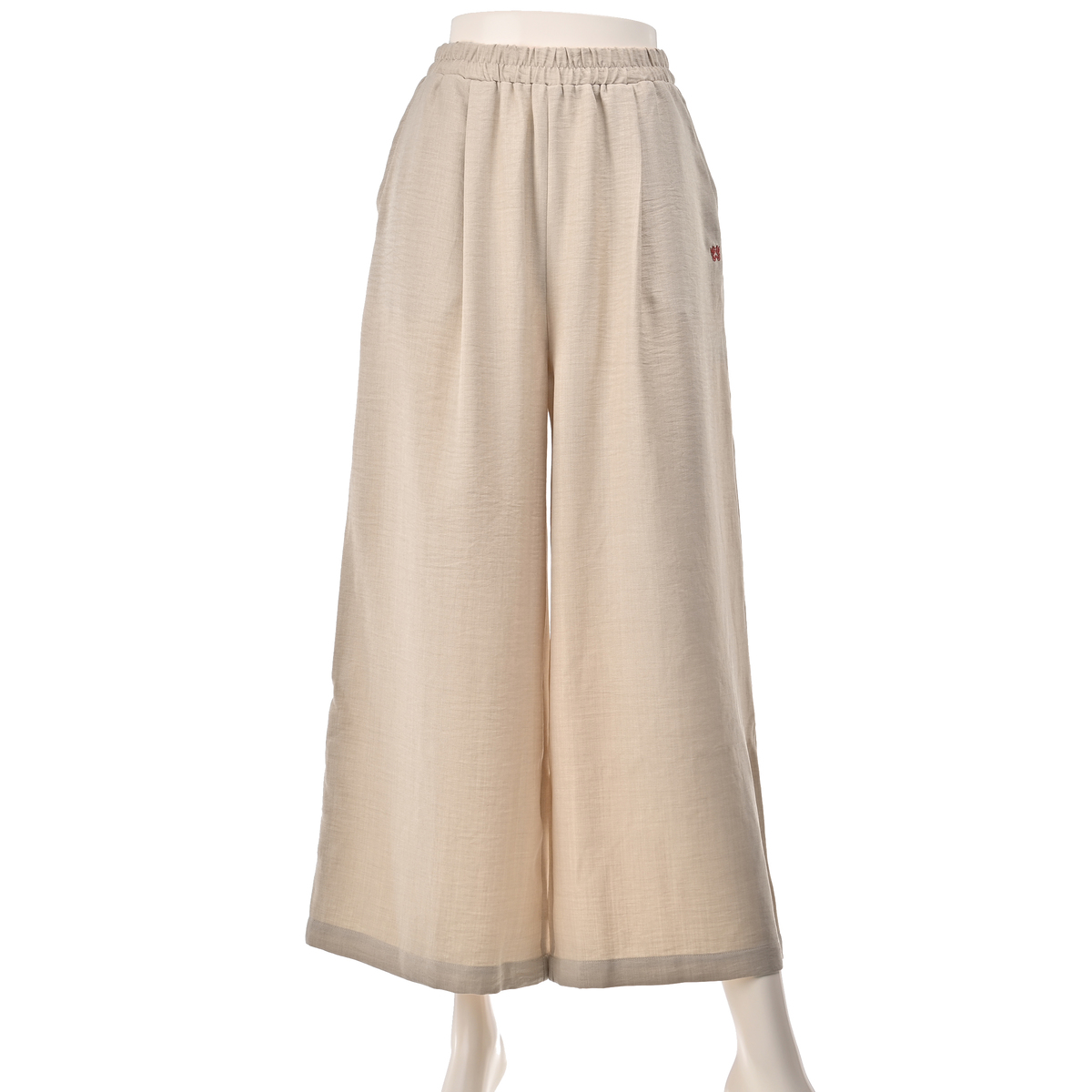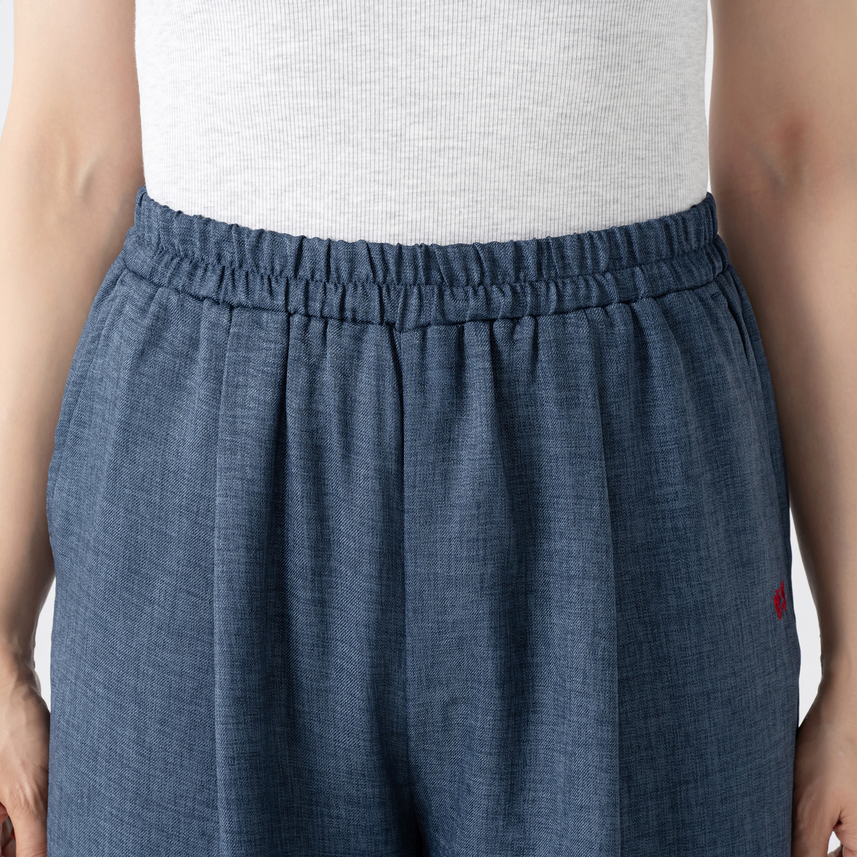 ふっくらと織り上げた麻調合繊で、やわらかな風合いが印象的なワイドパンツ。フロントタックやウエストゴムがゆとりを生み、風通しが良く、快適な穿き心地です