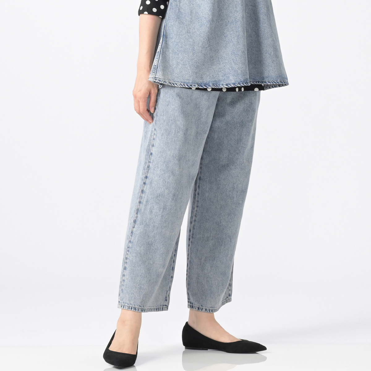 落ち感のある柔らかなデニム生地のタックワイドパンツ。ほどよい厚みで、真冬以外はそのまま素足で穿ける生地感で、太めのスラブも入っている本格デニムです