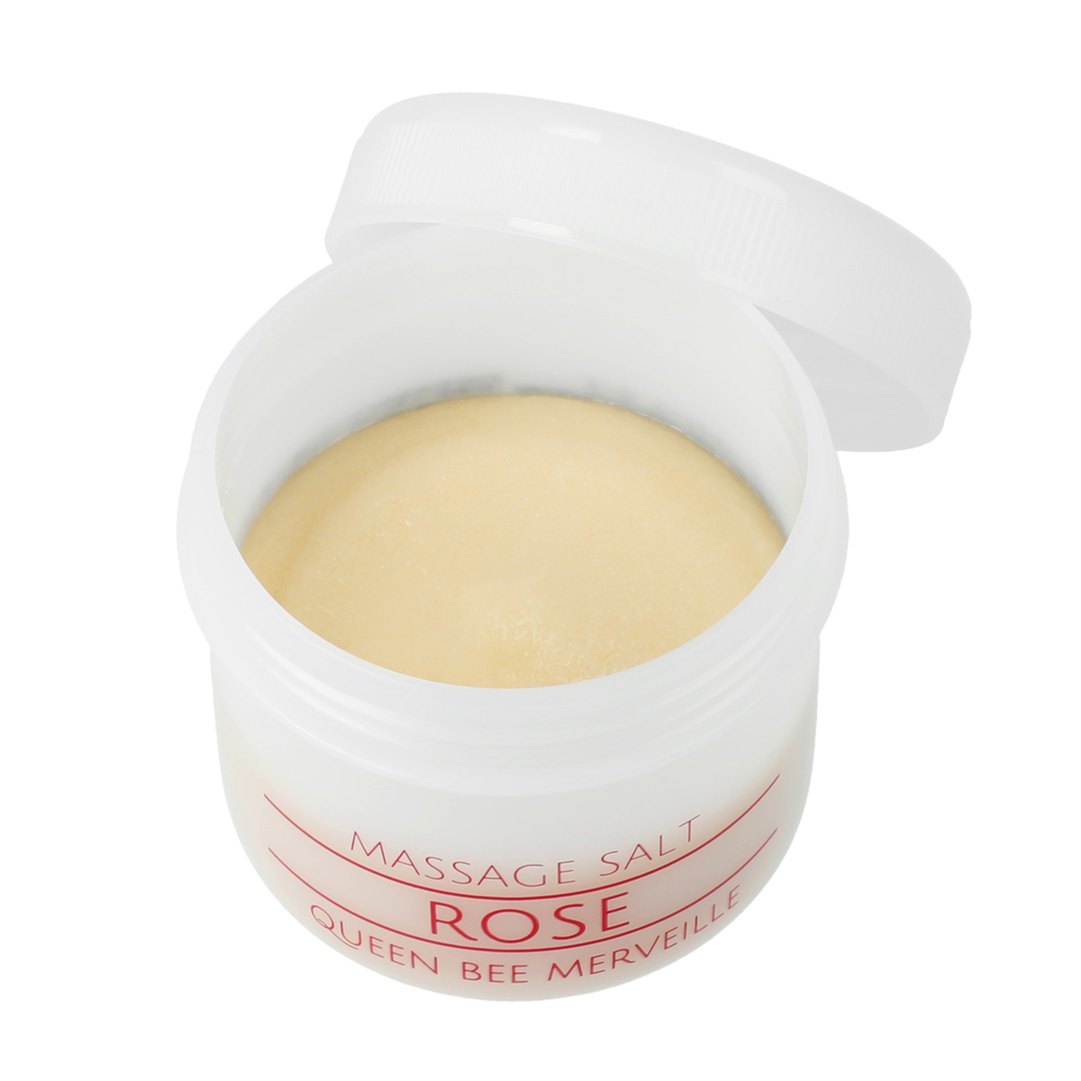 こだわりの3種類の塩を配合*3。顔はもちろん頭皮から爪先まで。毎日、全身にお使いいただける、微粒子でなめらかなマッサージソルト。「クインビー養蜂園」*4で採取した、ローヤルゼリーエキス*5、プロポリスエキス*6、ハチミツ(保湿)を配合。ウマプラセンタエキス*1も配合しています