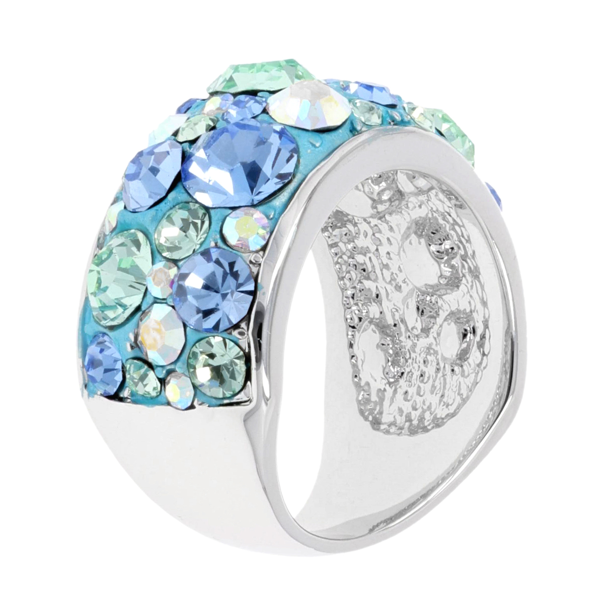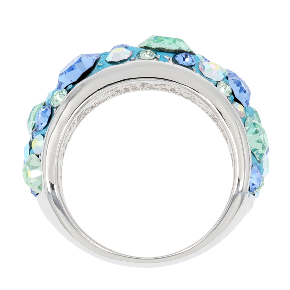 クリスタルガラスをふんだんにあしらったリングです。ランダムな配置が生み出す光の表情が、指元に華やぎと存在感をもたらします