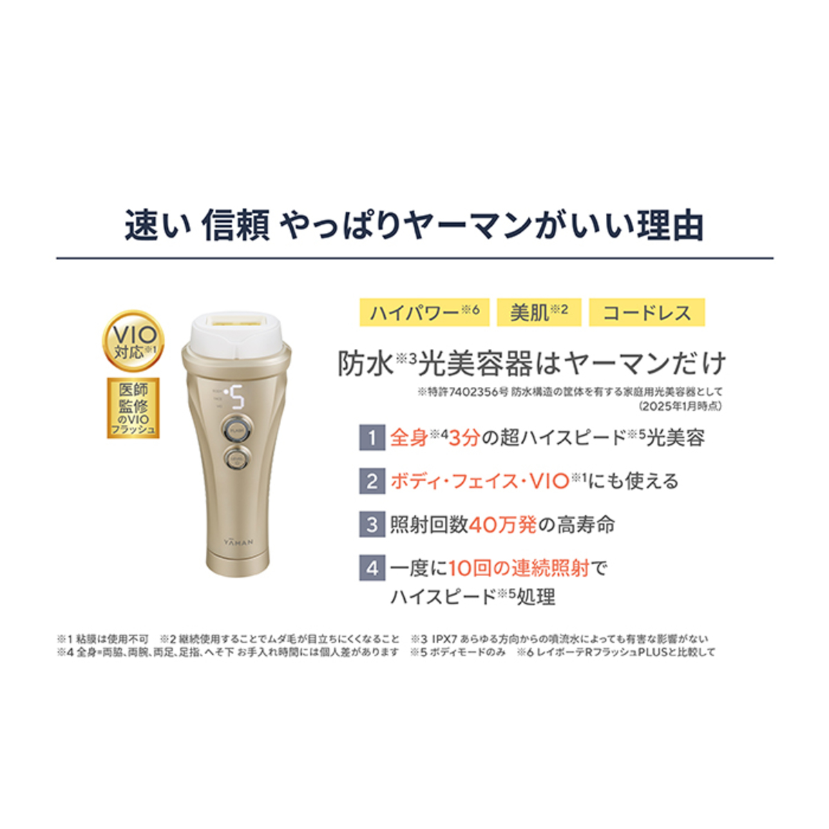 充電式・コードレスで、防水性能のある光美容器です(防水機能 IPX7 *)。VIOトリートメントについて、製品の出力と波長は医師が監修しています