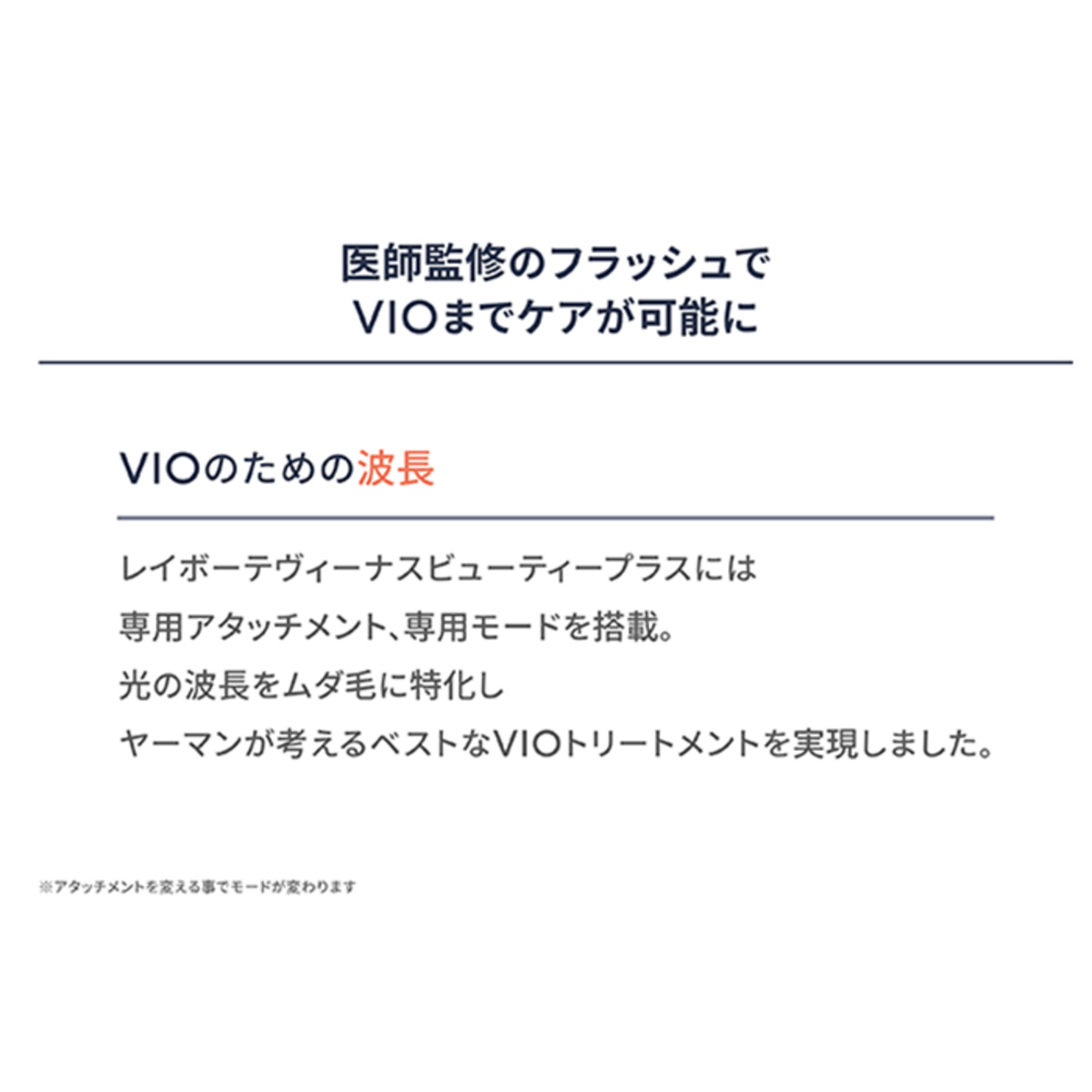 VIOにもご使用できるようにアタッチメント付き(フェイスアタッチメント、VIアタッチメント、Oアタッチメントの3種類)。顔やVライン、Iライン、Oラインをケアするときは、必ず正しいアタッチメントを取り付けてご使用ください