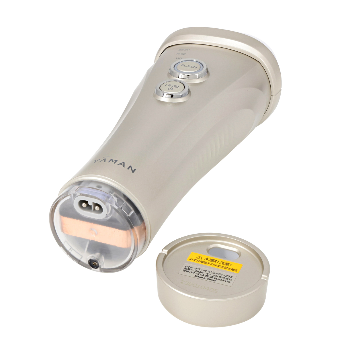 [商品内容] ・本体 ・フェイシャルアタッチメント ・VIアタッチメント ・Oアタッチメント ・Vデザインツール ・ACアダプター [サイズ] 約8.2×6.5×20.3cm [重量]約450g [充電時間] 約2時間30分充電で20分間使用可能 [材質] 本体:ポリカーボネート樹脂、ナイロン樹脂、ABS樹脂、ガラス アタッチメント:ポリカーボネート樹脂、ステンレス(照射口)、ガラス、シリコーン [使用方法] ・本体を充電します ・ケアする部位のムダ毛をシェーバーやカミソリで除毛します ・電源をオンにします 電源/レベルボタンを長押しします(約3秒)。モード表示とレベル表示が点灯し、ピピッと音が鳴ったらスタンバイ状態です ・モードを確認します ・レベルを選びます 電源/レベルボタンを押すごとに「ピッ」とブザー音が鳴り、レベルを変更できます ・ケアしたい部位に照射します 「ピピッ」とブザー音が鳴ったら、お肌に照射口をあてます。照射ボタンが白く点灯したら、照射ボタンを押してフラッシュを照射します ・電源をオフにします 電源/レベルボタンを3秒間長押しします 本体に内蔵されたファンが止まったことを確認してください(約3分) ・ケア後は保冷剤・冷やしたタオルなとで照射したお肌を冷やし、化粧水などで照射したお肌を保湿してください ■取り扱い説明を十分にご確認の上、ご使用下さい 【中国製】 [注意事項] ※次に該当する人は使用しない 医用電気機器を使用している人 ・ペースメーカーなど体内植込式医用電気機器 ・人工心肺など生命維持用医用電気機器 ・心電計などの装着型医用電気機器 ※次のような人は使用しない ・心臓疾患、障害及びその疑いのある人 ・温度や刺激の感覚が自覚できない人 ・妊娠初期から出産直後までの人 ・自己免疫疾患のある人 ・黒皮症の人 ・てんかんの疾患がある人 ・光過敏症の人 ・光線力学療法等で光増感剤を使用している人 ・幼児や自分で意思表示できない人 ※次の人はご使用前に医師にご相談ください ・急性疾患の人 ・感染症疾患の人 ・悪性腫瘍のある人 ・有熱性疾患の人 ・高血圧の人や血液疾患のある人 ・発熱している人 ・糖尿病などの高度な末しょう循環機能障害による知覚障害のある人 ・神経障害のある人 ・皮膚病およびアトピー性皮膚炎の人 ・通院して薬を服用中の人 ・アレルギー体質、接触性皮膚炎等、皮膚に既往症のある人や使用に際してお肌に不安のある人 ※次のような場合や部位には使用しない ・お肌に傷や発疹、炎症等の異常がある場合 ・酒気帯びの場合 ・口内や粘膜など ・眼球 ・まぶた(眼窩) ・のど ・膨らんだホクロ ・ウイルス性のイボ ・骨折をしている部位 ・美容医療施術後に内出血や腫れ、かさぶた等のある部位 ※施術後2週間はご使用を控えていただき、医師にご相談の上、問題なければご使用いただけます(施術例:ヒアルロン酸注入、シリコン注入、ボトックス、糸リフト、二重整形、HIFU等) ・傷跡やしみなど色の濃い部分 ・眉、額、頭髪(もみあげ含む) ・耳 ・乳首、乳輪 ・うなじ ・へそ内部 ・大静脈等血管が見える部位 ・刺青、タトゥー、ボディペイント ※電源をオンにした状態で他の美容機器や電気製品に接触させない。 ※他の電気製品(電気毛布・敷布・こたつ等)との同時使用はしない ※ケアしたい部分全体に照射できるように、少しずつ位置を変えながらケアを行ってください。連続照射で使用するときも、照射箇所を移動させながら使用してください。1箇所に照射したらいったんお肌から離して、次の箇所へ移動させてください。照射口の大きさが、一度にケアできる範囲です ※1日に2回以上、同じ部位に照射しないでください ※顔やVライン、Iライン、Oラインをケアするときは、必ず正しいアタッチメントを取り付けてください ※フェイスラインは特にお肌が照射口に入り込みやすいので、フラッシュ照射時は強く押しあてないようにご注意ください ※電源オフ後、再度使用するときは必ず10分以上あけてからご使用ください