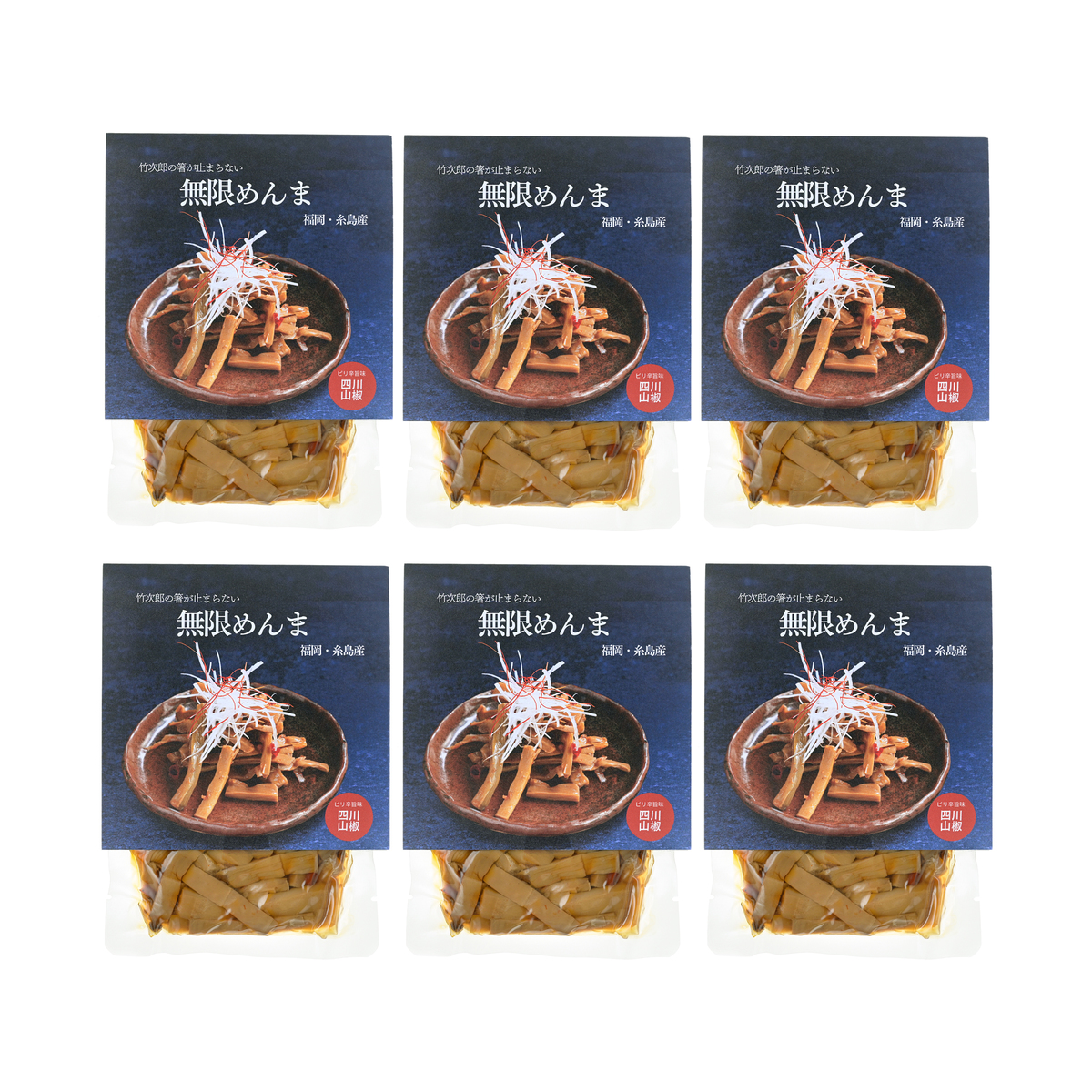 [アレルギー物質特定原材料8品目] 小麦 [内容量] 100g×6袋 [賞味期限] 出荷時点で賞味期限まで60日以上ある商品をお届けします [保存方法] 開封前:直射日光を避け、冷暗所(25℃以下)に保存 開封後:開封後は冷蔵保存(10℃以下)の上、なるべく早くお召し上がりください [お召し上がり方] そのまま袋から出してお召し上がりください [注意事項] ※まれに短い黒っぽい繊維状のものが含まれている場合がございますが、これは原材料である筍の皮の一部です。品質には問題ございません ※メンマの表面や漬け汁に白い物がみられることがありますが、チロシン(アミノ酸の一種)で人体に害はありません [原料原産地] たけのこ(国産) [原産国] 日本 [原材料] 無限めんま 出汁醤油:たけのこ(国産)、醤油、砂糖、みりん、ごま油、梅酢加工製品、かつお節エキス、昆布エキス、(一部に小麦・大豆・ごまを含む) 無限めんま 四川山椒:たけのこ(国産)、醤油、砂糖、みりん、食用植物油脂、ラー油、ごま油、梅酢加工製品、にんにく、生姜、かつお節エキス、昆布エキス、花椒、唐辛子、(一部に小麦・大豆・ごまを含む)