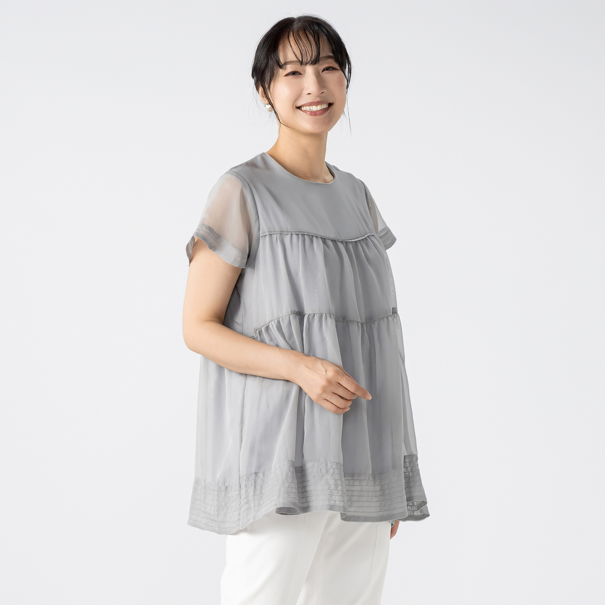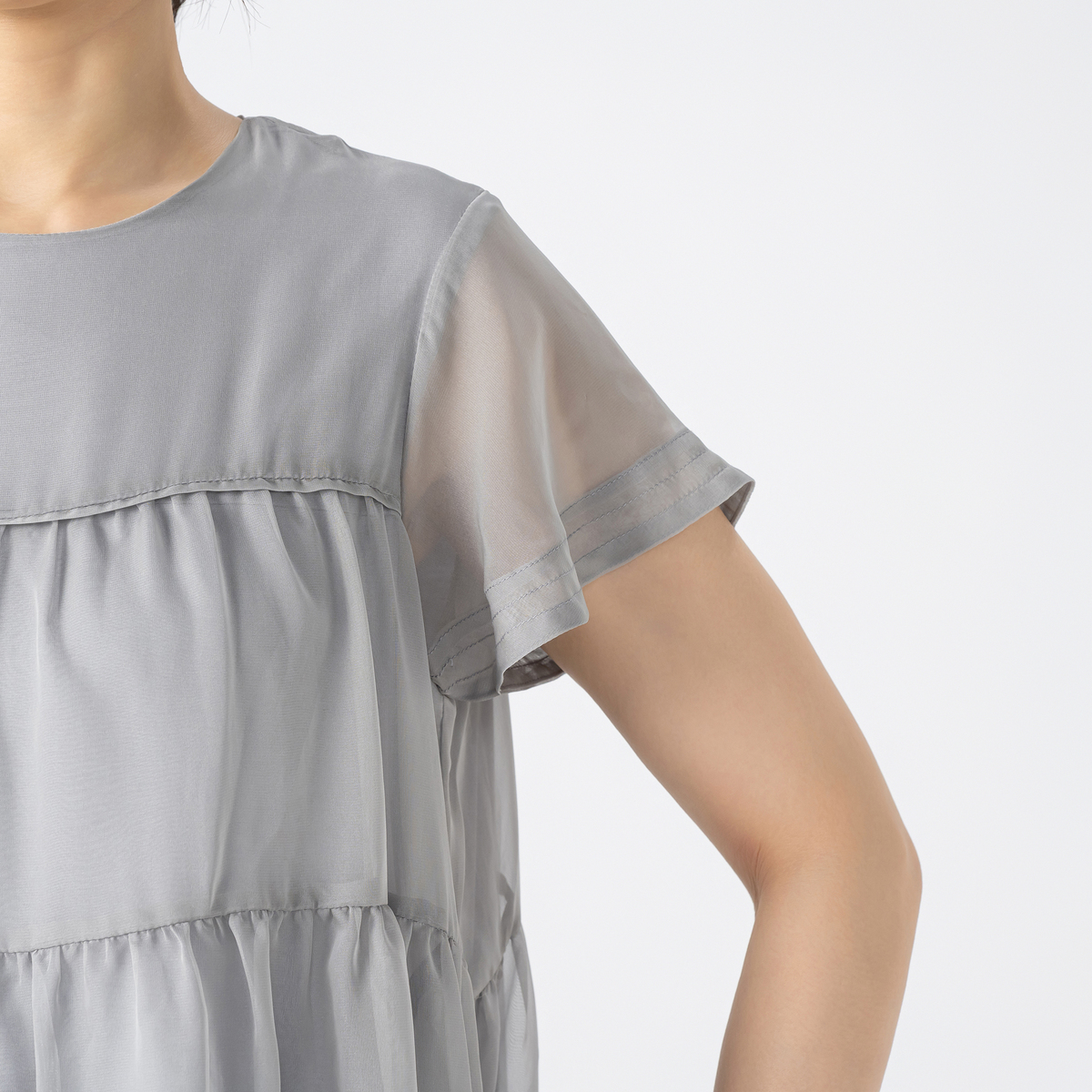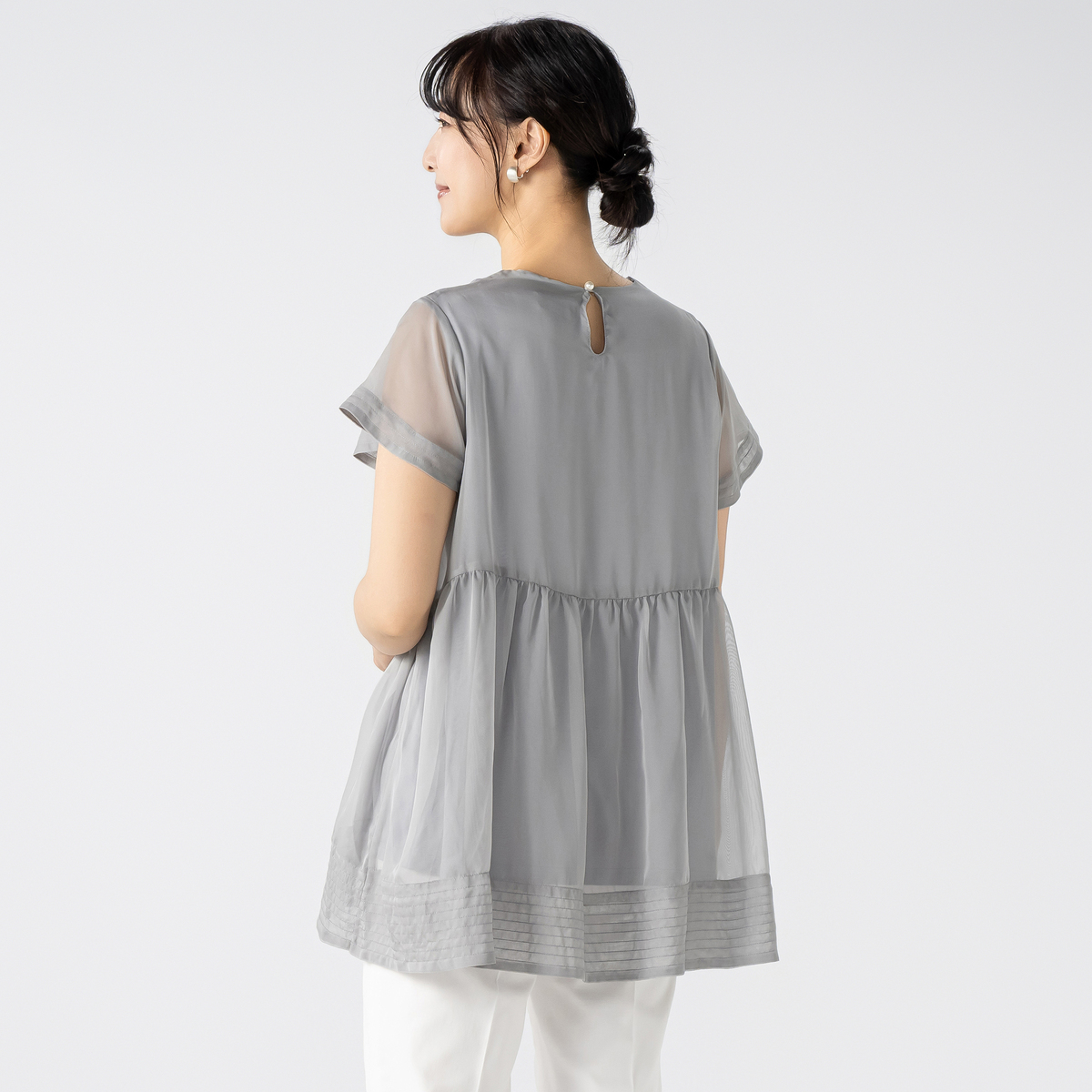 柔らかなシフォンを贅沢に使用したチュニック。優雅なAラインのティアードシルエットで、裾と袖口には複数のデザインステッチを施しました