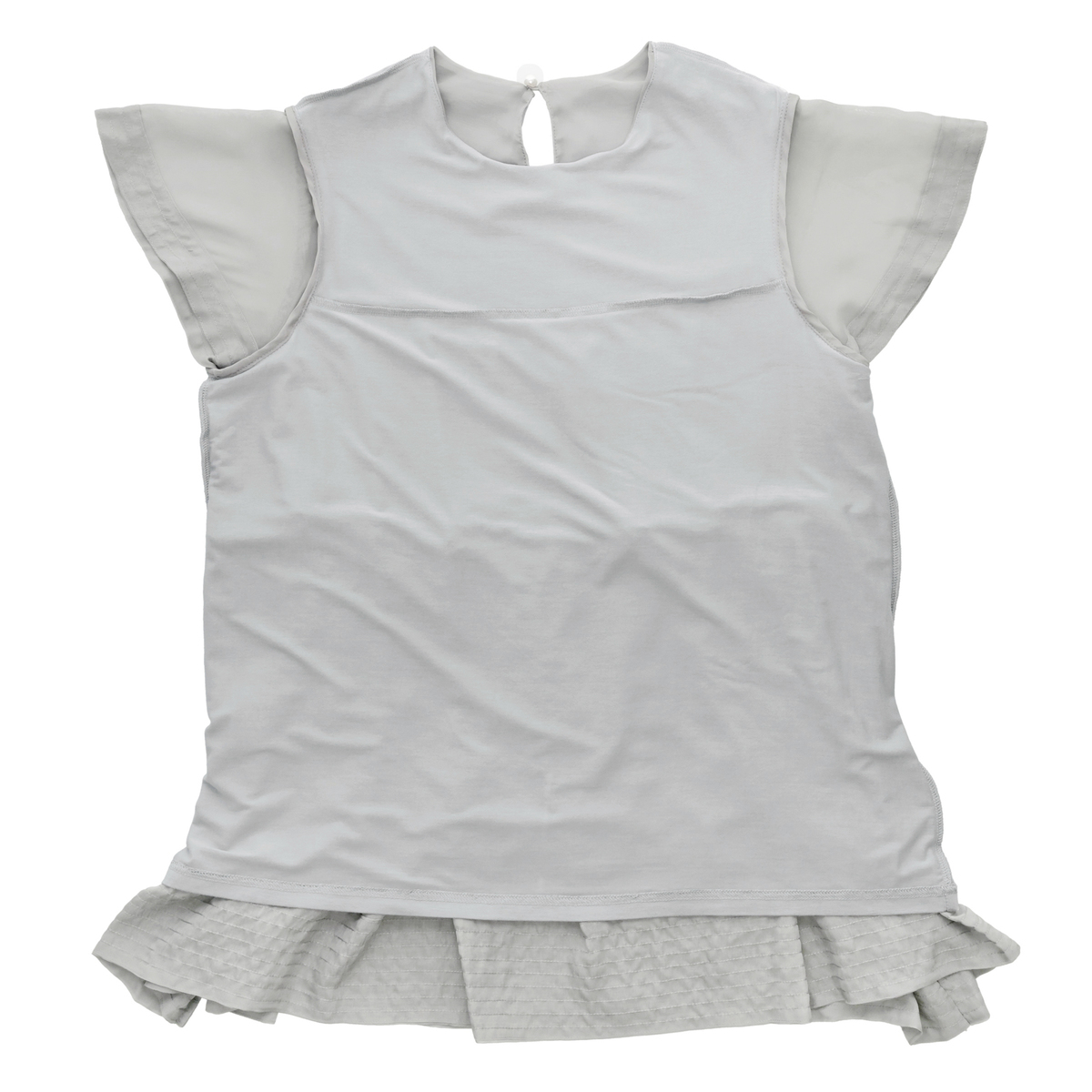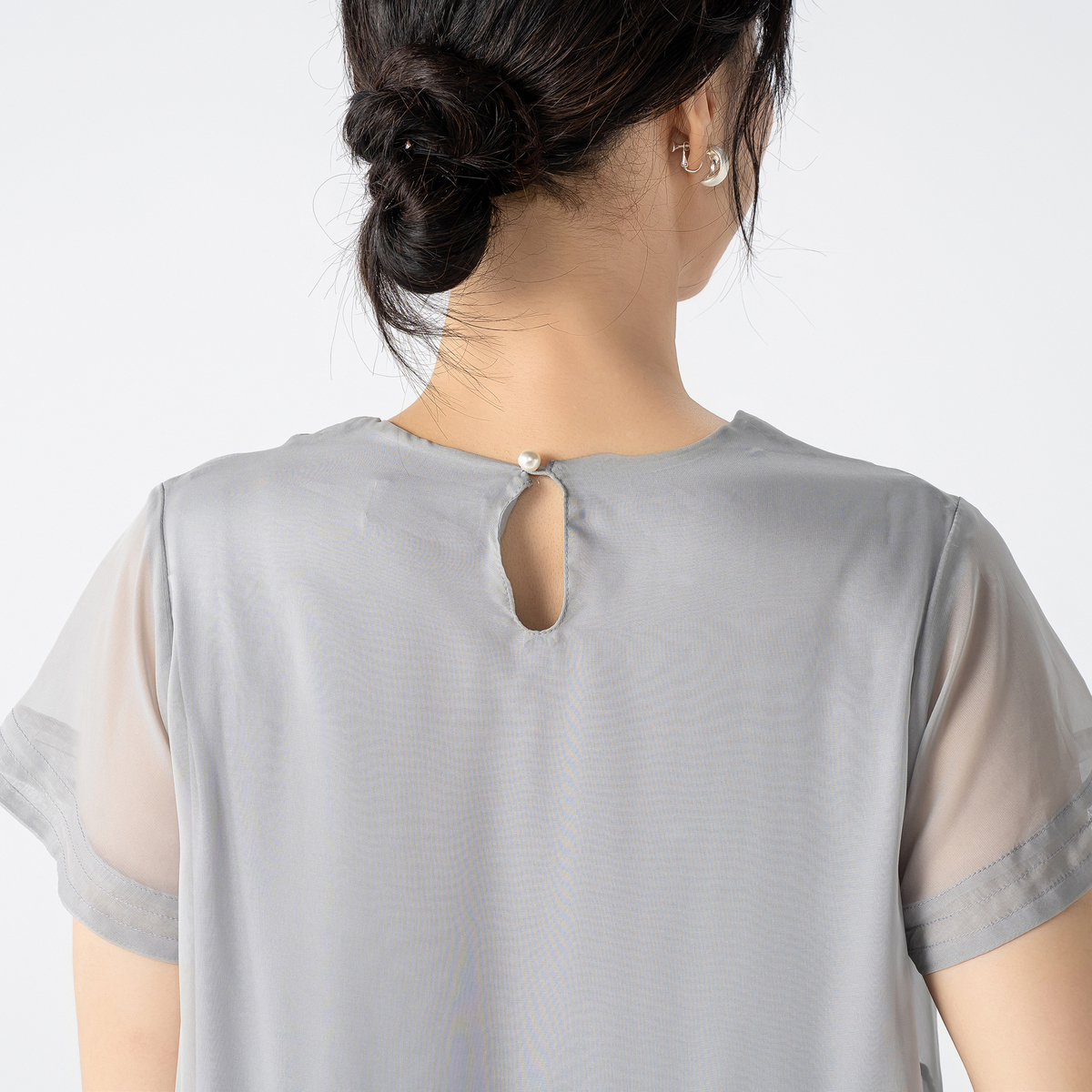 身頃部分は裏地としてサラリとしたカットソーを使い、インナーの透け感が気になりにくい仕様。衿ぐり後ろ中心はパール調ボタンをあしらった涙開き仕様になっています