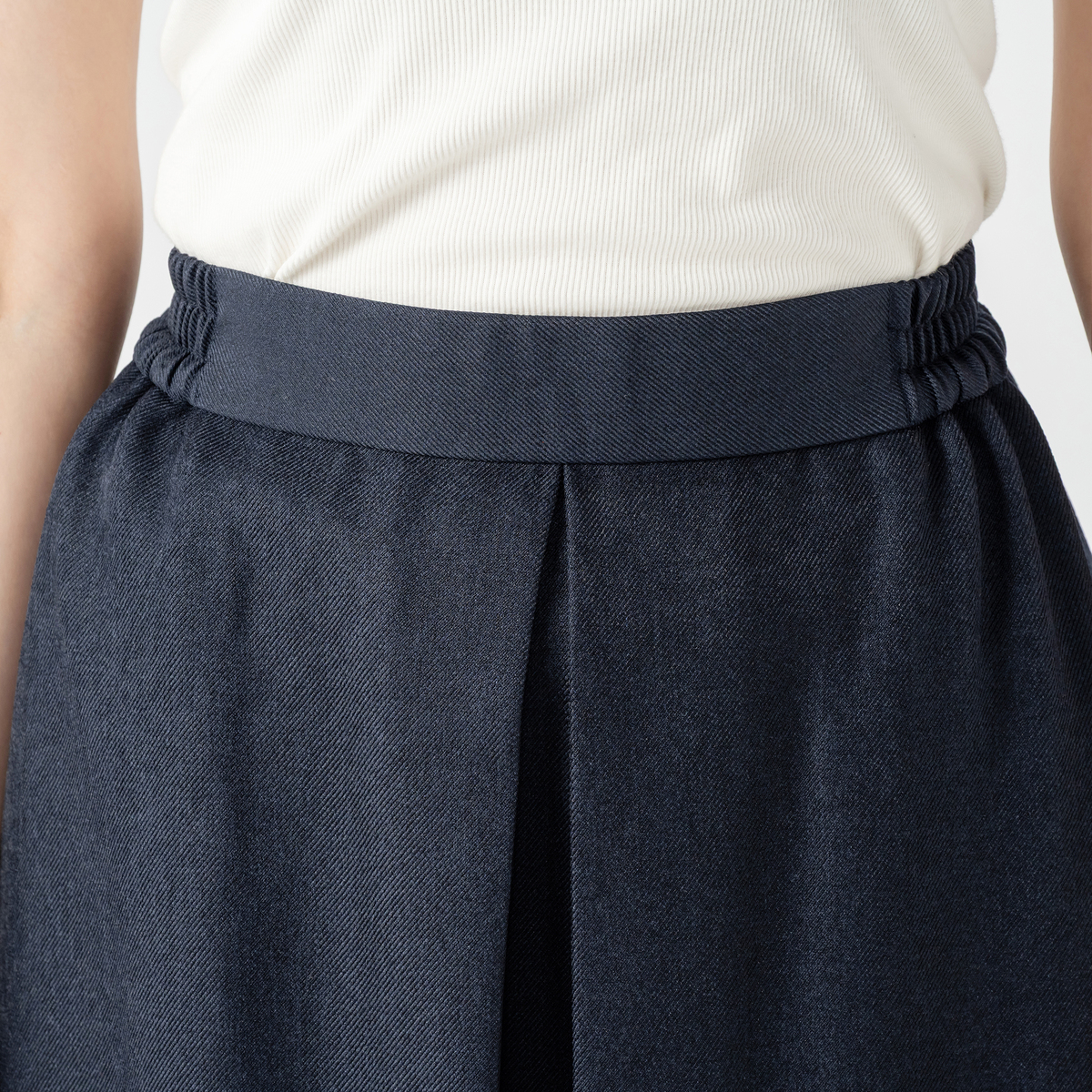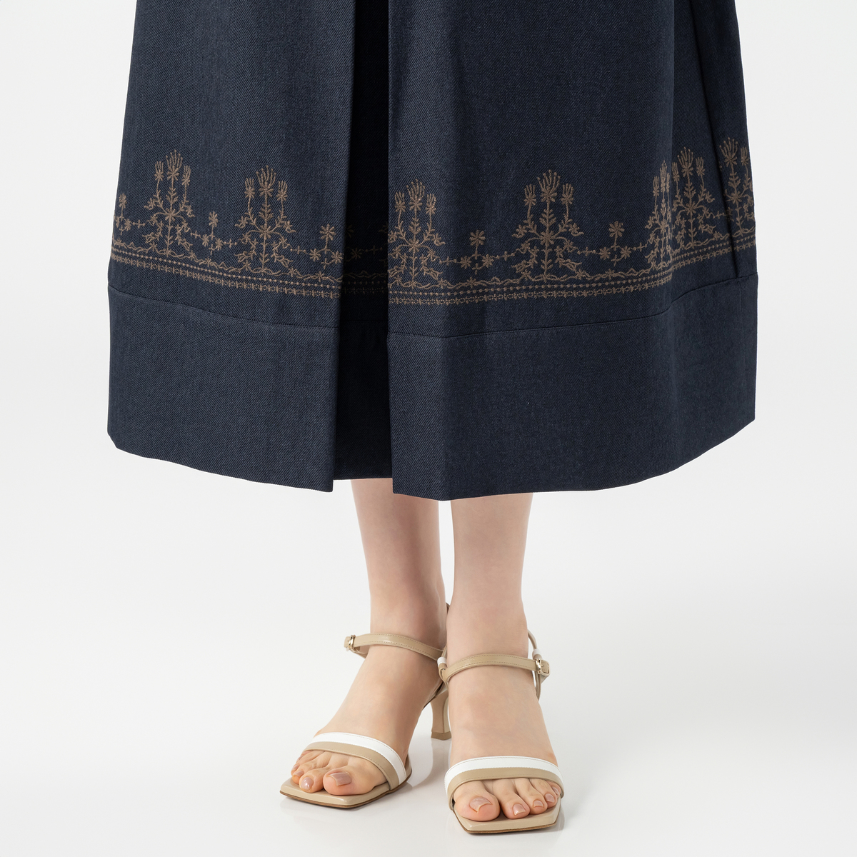 裾に一周オリジナルの刺繍をあしらった贅沢なフレアスカート。フレアが立体的に広がるようタックの分量を調節。フロントにはボックスタック入りでアイラインをつくりました