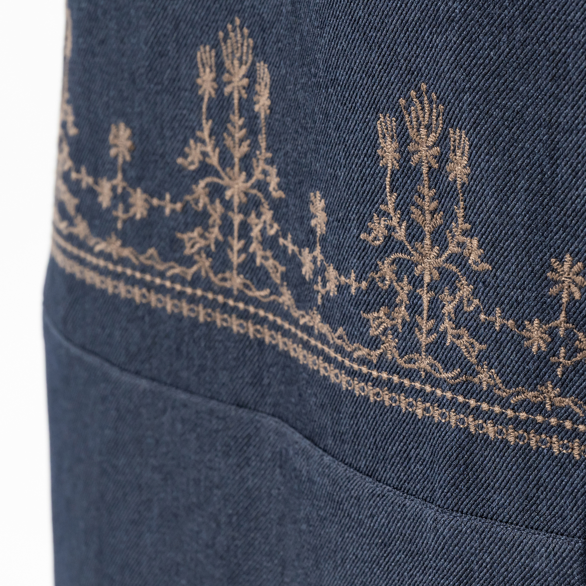 あたたかみのあるカルゼ素材の生地に、オリジナル刺繍を施してデザイン。両脇にはスラッシュ開きのポケット付きに。裾は太幅でカフスのダブル仕立てになり、広がらず落ち着いた大人の上品シルエットです