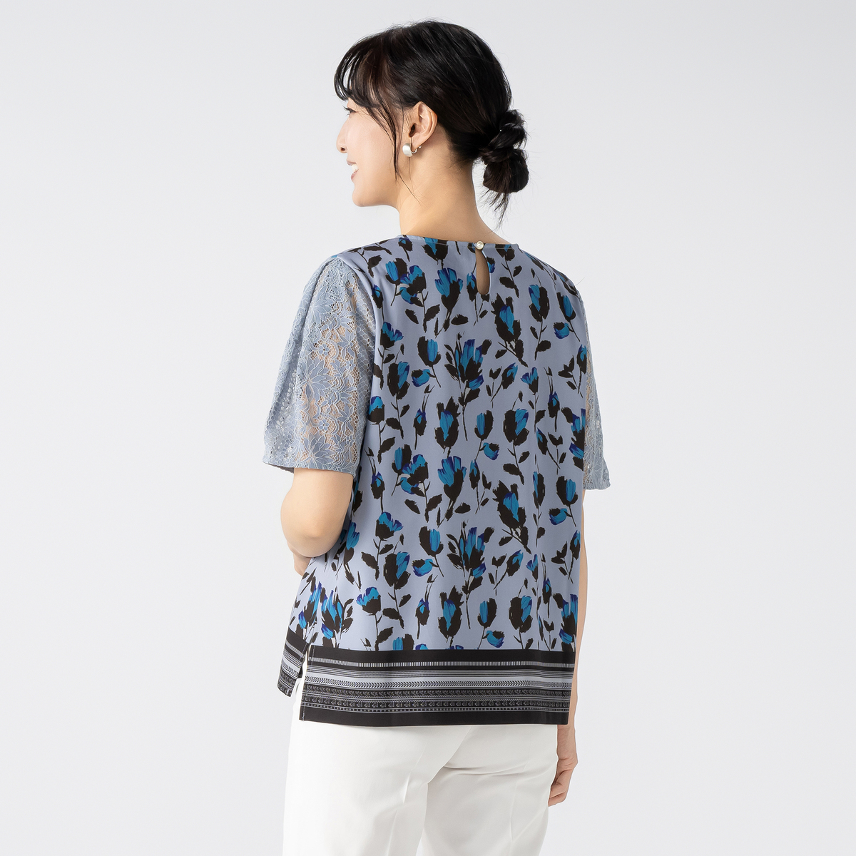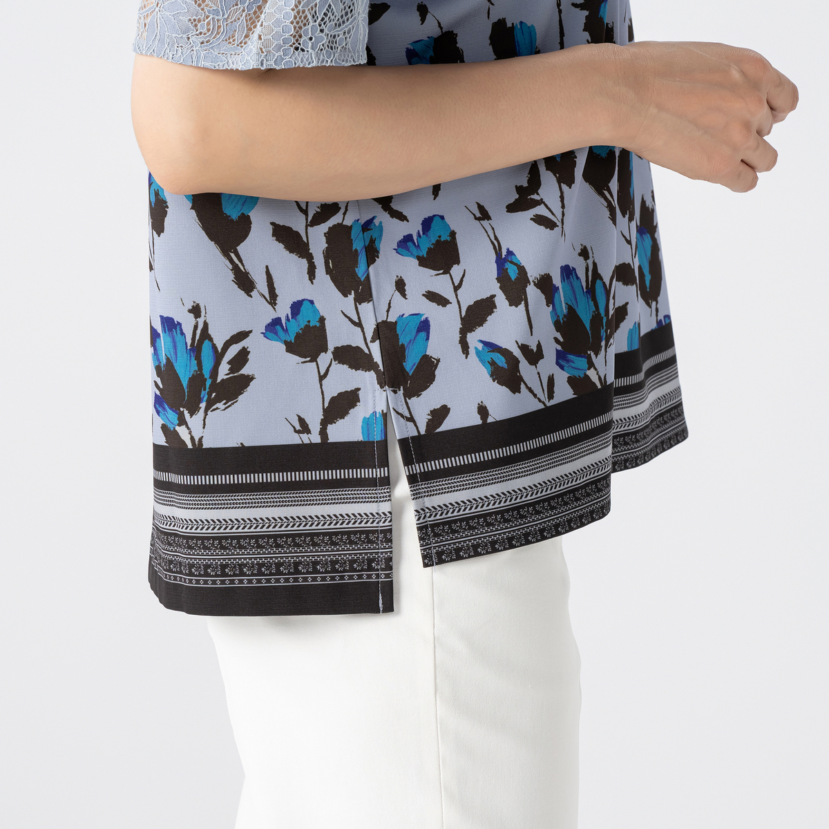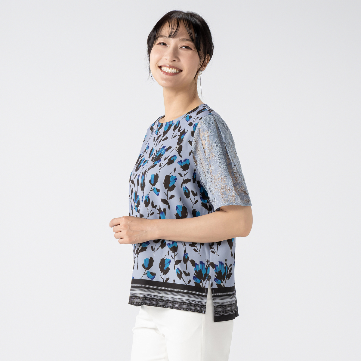 コーデのポイントになってくれる華やかなフラワープリントのブラウス。袖にはコードレースを贅沢にあしらいアクセントになっています