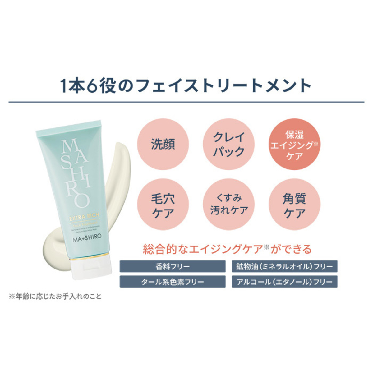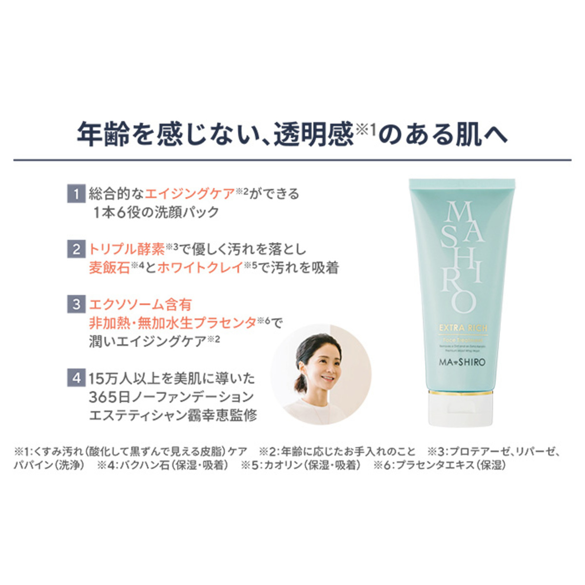 これ1本で、洗顔、パック、角質ケア、毛穴ケア、くすみ汚れ(*1)ケア、保湿によるエイジングケア(*2)の6役。たった30秒なじませて洗い流すだけ。酵素(*3)で汚れを落とし、麦飯石(*4)で汚れを吸着、プラセンタエキスなどのうるおい保湿のトリプルアクションで美肌へと導きます