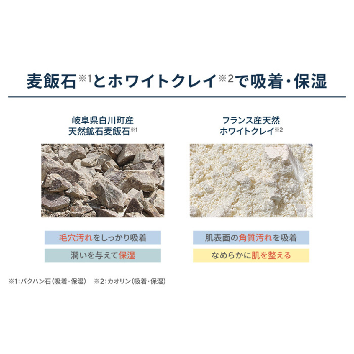 酵素(*3)を3種類配合。プロテアーゼ、パパインはたんぱく質分解酵素で古い角質に、リパーゼは皮脂分解酵素で、皮脂汚れにアプローチします。麦飯石(*4)が毛穴の奥の汚れまで吸着、ホワイトクレイ(*5)が肌表面の古い角質を吸着。潤いを与えながら肌に不要な汚れを吸着します