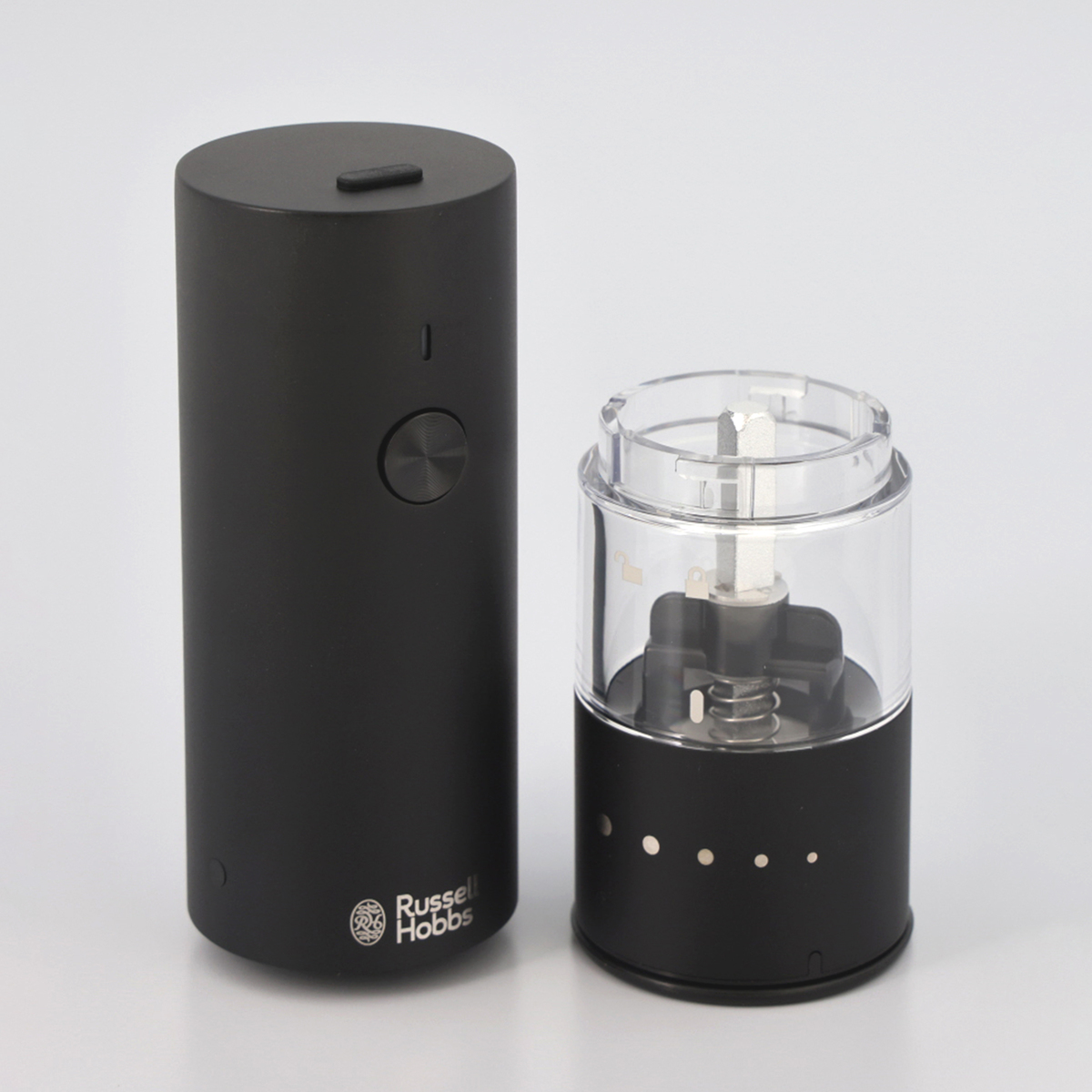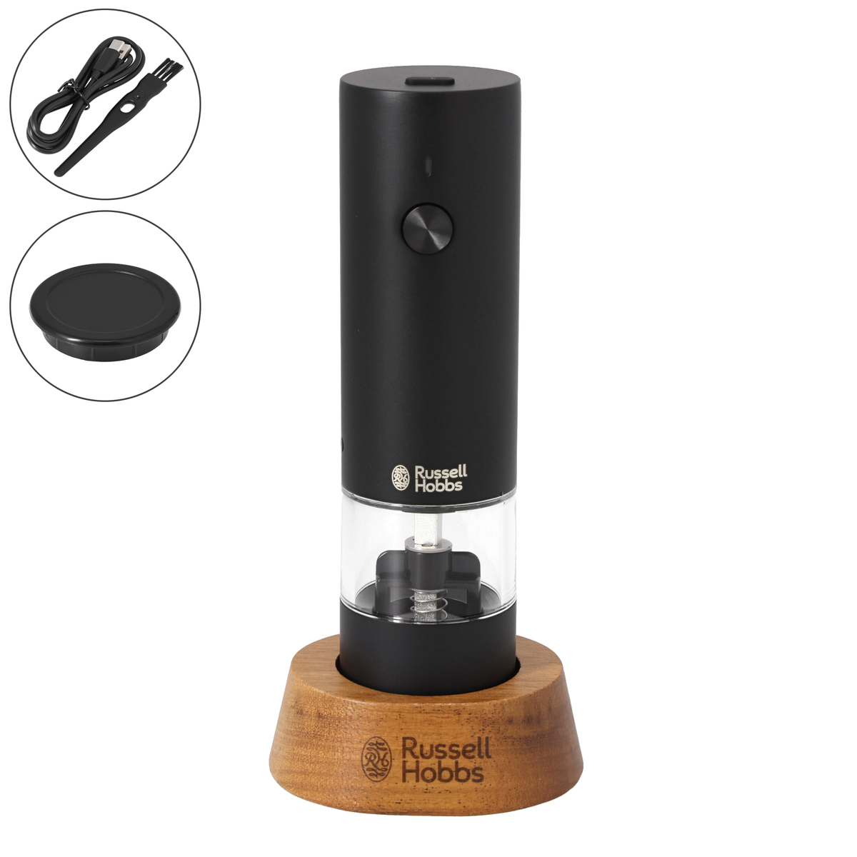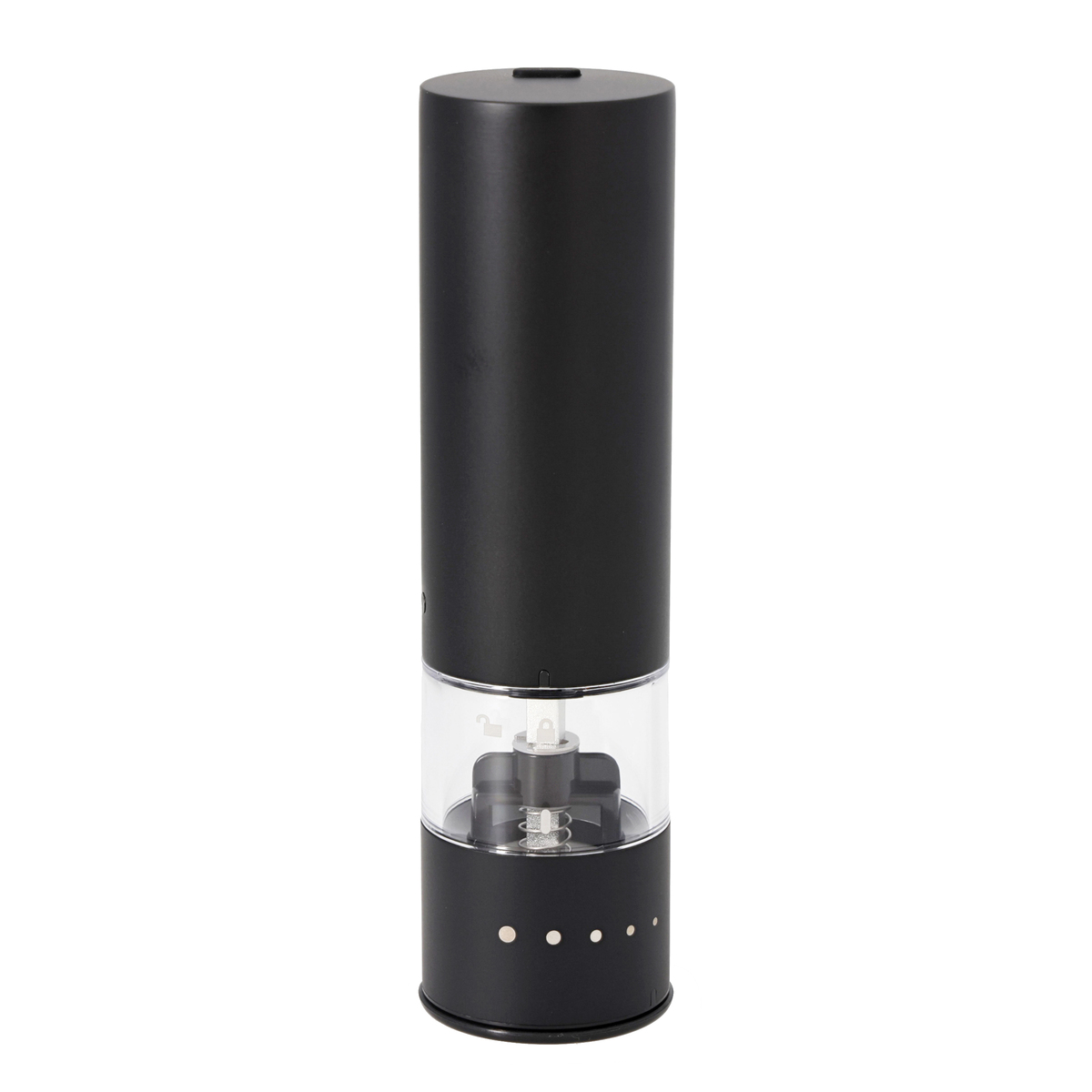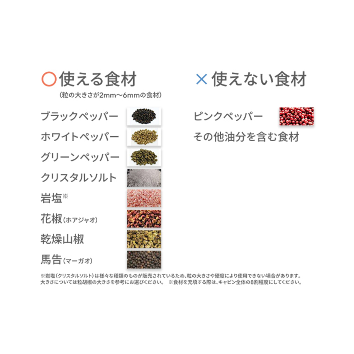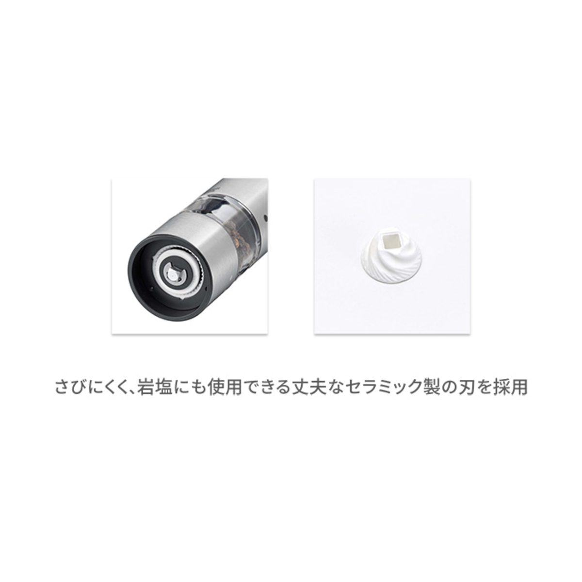 [商品内容] ・本体 ・充電用USBケーブル(TypeA to TypeC) ・キャップ ・スタンド ・ブラシ ※ACアダプターは付属しません。DC5V/2A以下のACアダプターをご使用下さい [サイズ(約)]幅×奥行×高さ 4.0×4.0×14.0cm スタンドセット:7.0×6.0×15.0cm [重量(約)] 180g スタンドセット:210g [材質] ステンレス、セラミック、PCTG 樹脂、ABS 樹脂 [充電時間] 約1時間 [ご使用頂ける食材詳細] 粒の大きさが2mm〜6mmの食材 〇…ブラックペッパー・ホワイトペッパー・グリーンペッパー・クリスタルソルト・岩塩、花椒(ホァショー)・山椒・馬告(マーガオ)・その他球形状の乾燥ハーブやスパイス ×…ピンクペッパーは使用できません。また、その他の油分を含む食材はグラインダー(臼の部分)に食材が挟まってしまう可能性があります ※岩塩(クリスタルソルト)は様々な種類のものが販売されているため、粒の大きさや硬度により使用できない場合があります。大きさについては粒胡椒の大きさを参考にお選び下さい [使用方法] 1、粒度を調節する キャビンのマークをキャビンユニットの粒度調節ガイド(マーク)位置に合わせて下さい。マークが大きいほど粗挽き、小さいほど細挽きになります 2、食材を入れる モーターユニットからキャビンユニットを取り外します。中央から食材を充填して下さい 3、モーターユニットにキャビンユニットを取り付ける 4、食材を挽く スイッチを押します。挽く量はスイッチを押している時間で調節して下さい 動作中はLEDランプが白く点灯します。動作停止後、約10秒後にLEDランプが消灯します 5、使用後はキャップを使用せずにスタンドに載せて下さい キャップをしてスタンドに載せると取り出せなくなる場合があります。キャップは持ち運びする際に使用して下さい ■取り扱い説明を充分にご確認の上、ご使用下さい 【中国製】 [お手入れ] <モーターユニット、キャビンユニット> 柔らかい乾いた布または水で湿らせてよく絞った柔らかい布で拭いて下さい ※塩分や汚れがステンレス部分に付着していると、そこからサビが生じる原因となる場合がありますので、こまめにお手入れをして下さい <スタンド> 柔らかい乾いた布で拭いて下さい <キャップ> 水洗いできます [注意事項] ※食材を充填する際は、キャビン全体の8割程度にして下さい。キャビンの容量一杯まで充填するとモーターユニットに取り付けられなくなる場合があります ※使用時や保管の際は、USBチャージングポートにUSBチャージングポートカバーを必ず取り付けて下さい。内部に食材やほこりが入ると、火災・故障の原因になります ※調理中の湯気などの湿気が本体に入り込まないようにご注意下さい。故障の原因になります ※取り付ける際は、スイッチに触れないようにご注意下さい。誤作動する場合があります ※キャップは必ず外して下さい ※動作中に食材がグラインダー部分に接触しなくなると、挽けなくなる場合があります。その場合は、本体を軽く振って食材をならしてから再度スイッチを押して下さい ※グラインダー部分やキャビンユニット底部は、定期的に付属のブラシでお手入れをして下さい(食材固着による故障の原因) ※モーターユニットやキャビンユニットは水につけたり、水洗いをしないで下さい(故障の原因) ※アルコール・ベンジン・シンナー・磨き粉・タワシなどは使用しないで下さい(傷・変形・変色・故障の原因) ※食器洗浄機や食器乾燥機は使用しないで下さい(故障の原因)