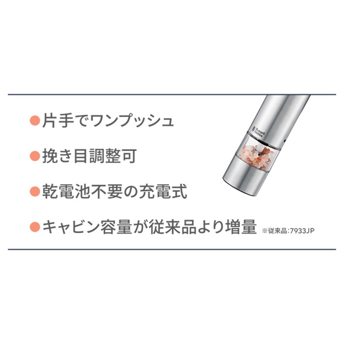 充電式(リチウムポリマー電池)のミルです。片手でワンプッシュするだけで塩や胡椒を挽けるため、調理中もスムーズ(*1)。コンパクトなサイズ感(*2)で料理の最後の仕上げにも、食事中の一足しにも便利にお使いいただけます