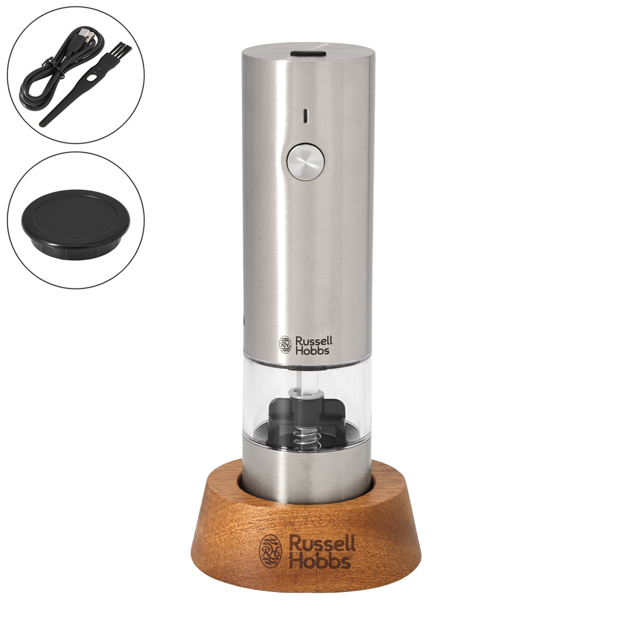 細かな塩や胡椒がテーブルを汚さないよう、ミルはキャップ付き。専用ウッドスタンドで転倒を防ぎます。掃除用ブラシも付属し、毎日の食卓やギフトにもおすすめです