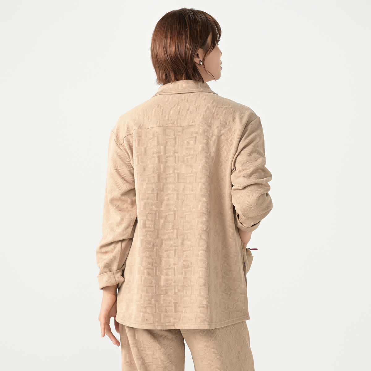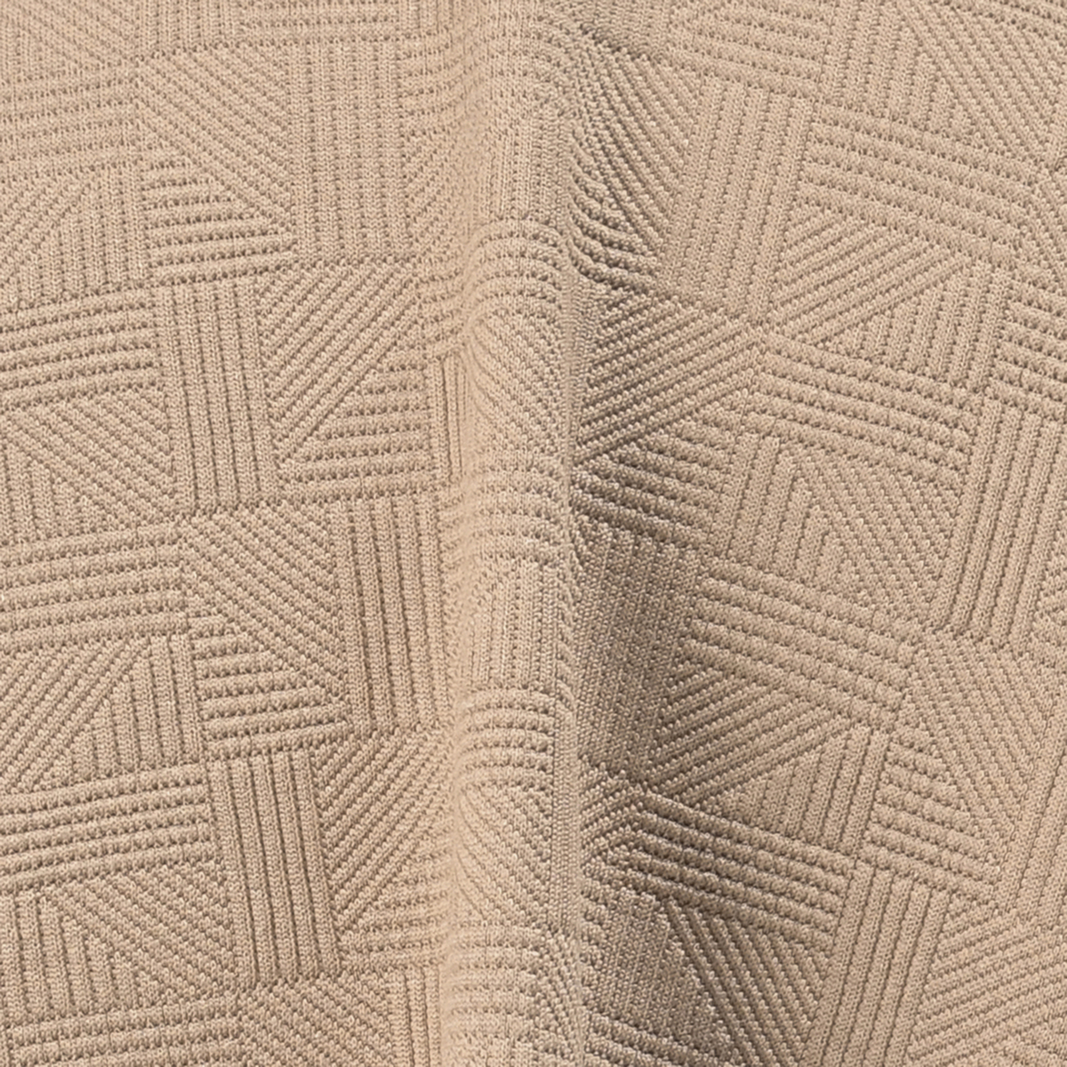 立体感のある膨れジャガード素材で、長方形の幾何柄が斜めに交差することで細見え効果も。裏はフラットなので下に重ね着しても滑りやすく、ごわつきにくいです。さらりとした肌ざわりで、肌に触れるとひんやり感じる接触冷感素材なので暑い季節に重宝します