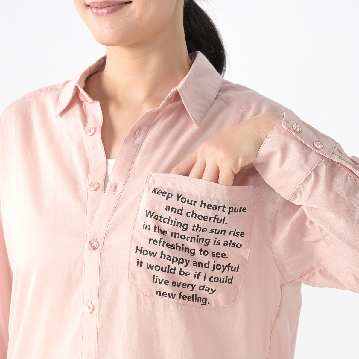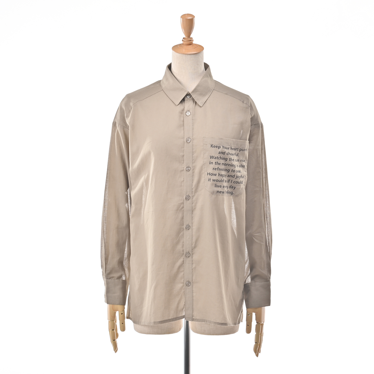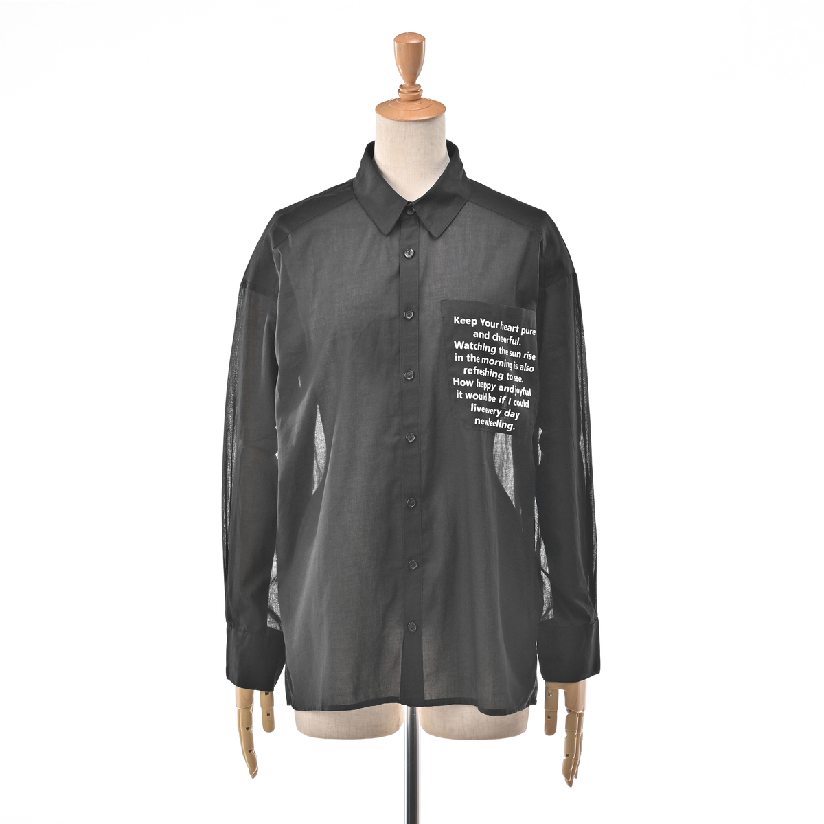 ハッピーメッセージ*をあしらったシアーシャツ。爽やかな透け感のある綿100%の素材で、軽くて肌触りも柔らかく、暑い季節の羽織にも適しています