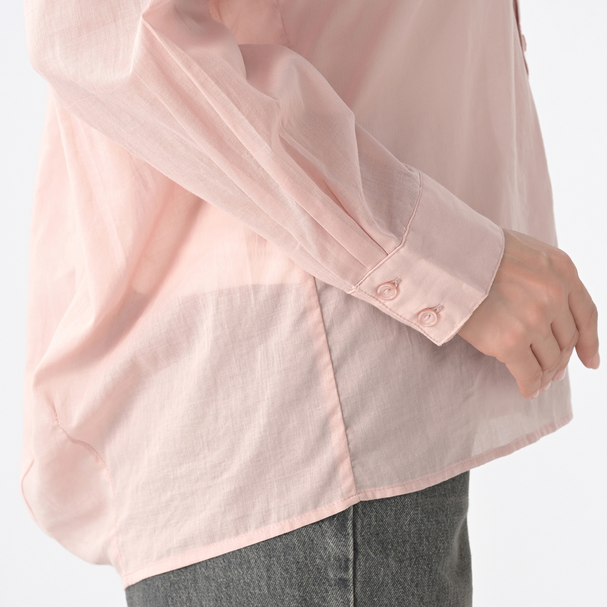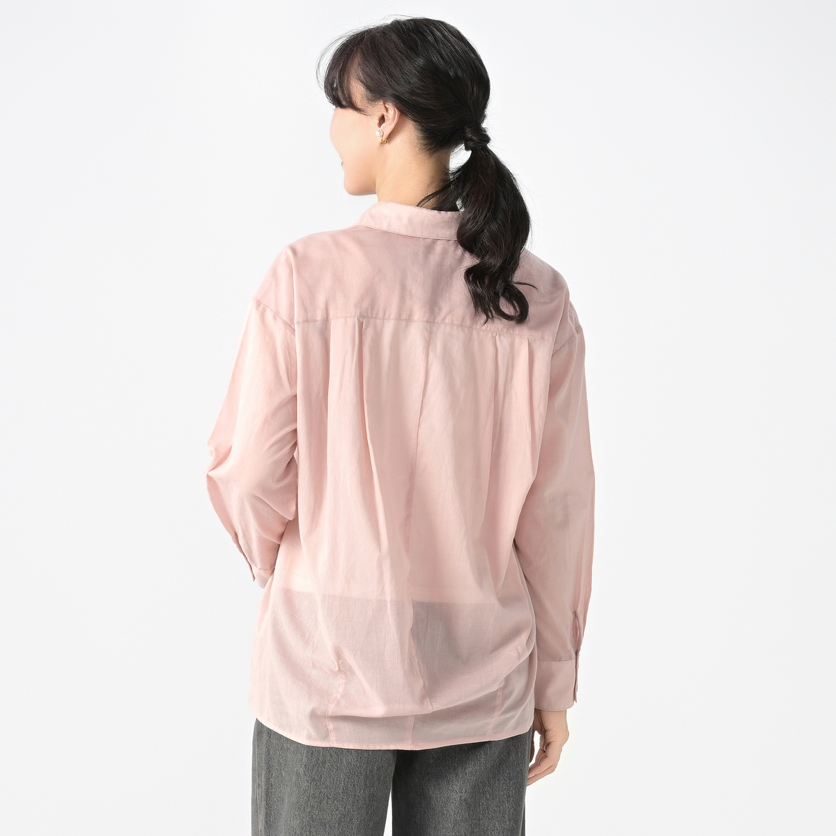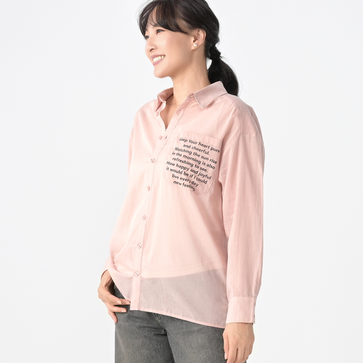 ハッピーメッセージ*をあしらったシアーシャツ。爽やかな透け感のある綿100%の素材で、軽くて肌触りも柔らかく、暑い季節の羽織にも適しています
