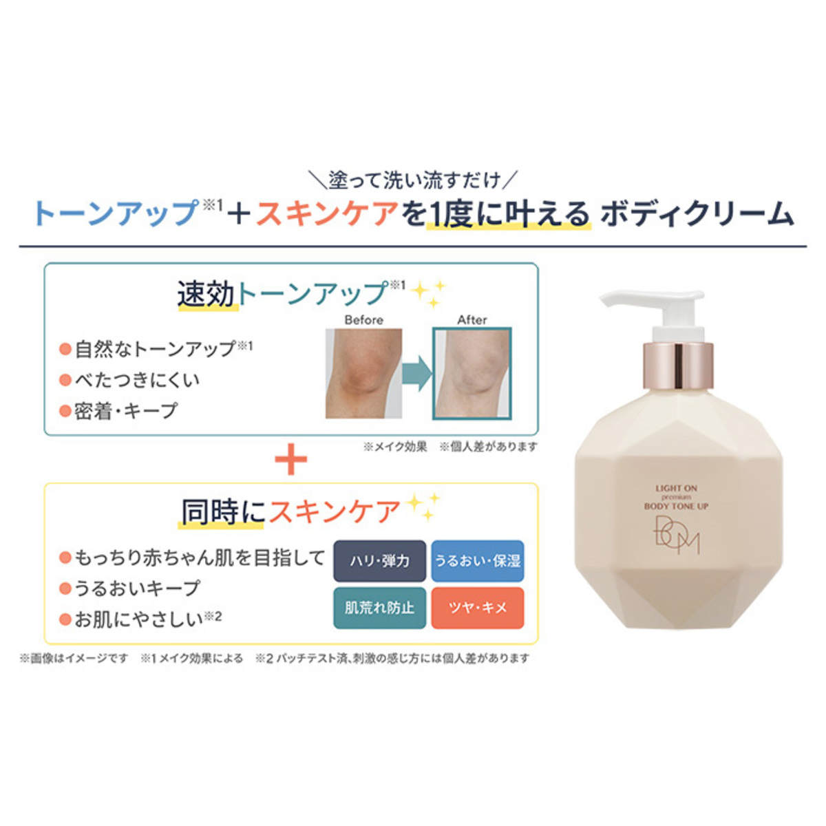 [商品内容] ・ライトオン プレミアム ボディ トーンアップ 290ml [使用方法] 使用方法1:シャワーの後、お肌に水気のある状態で適量を手に取り、お肌に伸ばしなじませてから洗い流してください ※乾いたお肌に、洗い流さずご使用いただくことも可能です 使用方法2:お顔にご使用いただく場合は、洗い流さずに、基礎化粧品を使用した後、お化粧の前にご使用ください [注意事項] ※お肌に異常が生じていないかよく注意して使用してください ※化粧品がお肌に合わないとき即ち次のような場合には、使用を中止してください。そのまま使用を続けますと、症状を悪化させることがありますので、皮フ科専門医等にご相談されることをおすすめします (1)使用中、赤み、はれ、かゆみ、刺激等の異常があらわれた場合 (2)使用したお肌に、直射日光があたって上記の様な異常があらわれた場合 ※目に入らないようにご注意ください 【韓国製】 [成分] 水、BG、DPG、ジメチコン、酸化チタン、グリセリン、ナイアシンアミド、シクロペンタシロキサン、トリペプチド-1銅、パルミトイルテトラペプチド-7、DNA-Na、シアノコバラミン、アデノシン、ヒアルロン酸Na、センチフォリアバラ花水、モモ果実エキス、ザクロ果実エキス、グレープフルーツ果実エキス、シラカンバ樹液、加水分解ムコ多糖、 ツボクサエキス、チャ葉エキス、オウゴン根エキス、カンゾウ根エキス、ローズマリー葉エキス、加水分解サンシキスミレエキス、カミツレ花エキス、無水キシリトール、キシリトール、キシリチルグルコシド、アラントイン、スベリヒユエキス、パールエキス、乳タンパクエキス、 ヨーグルトエキス、アセロラ果実エキス、コウゾ根エキス、イソヘキサデカン、ジメチコノール、エチルヘキシルグリセリン、プロパンジオール、ポリアクリルアミド、ポリソルベート80、(C13,14)イソパラフィン、オレイン酸ソルビタン、ラウレス-7、トリエトキシカプリリルシラン、(アクリル酸Na/アクリロイルジメチルタウリンNa)コポリマー、ベンジルグリコール、エチルヘキサンジオール、1,2-ヘキサンジオール、EDTA-2Na、フィチン酸Na、イタドリ根エキス、水酸化Al、 フェノキシエタノール、香料、ベンジルアルコール、サリチル酸ベンジル、クマリン、ゲラニオール、リナロール、安息香酸ベンジル、シトロネロール、ヘキシルシンナマル、リモネン、α-イソメチルイオノン、ファルネソール、オイゲノール、シトラール