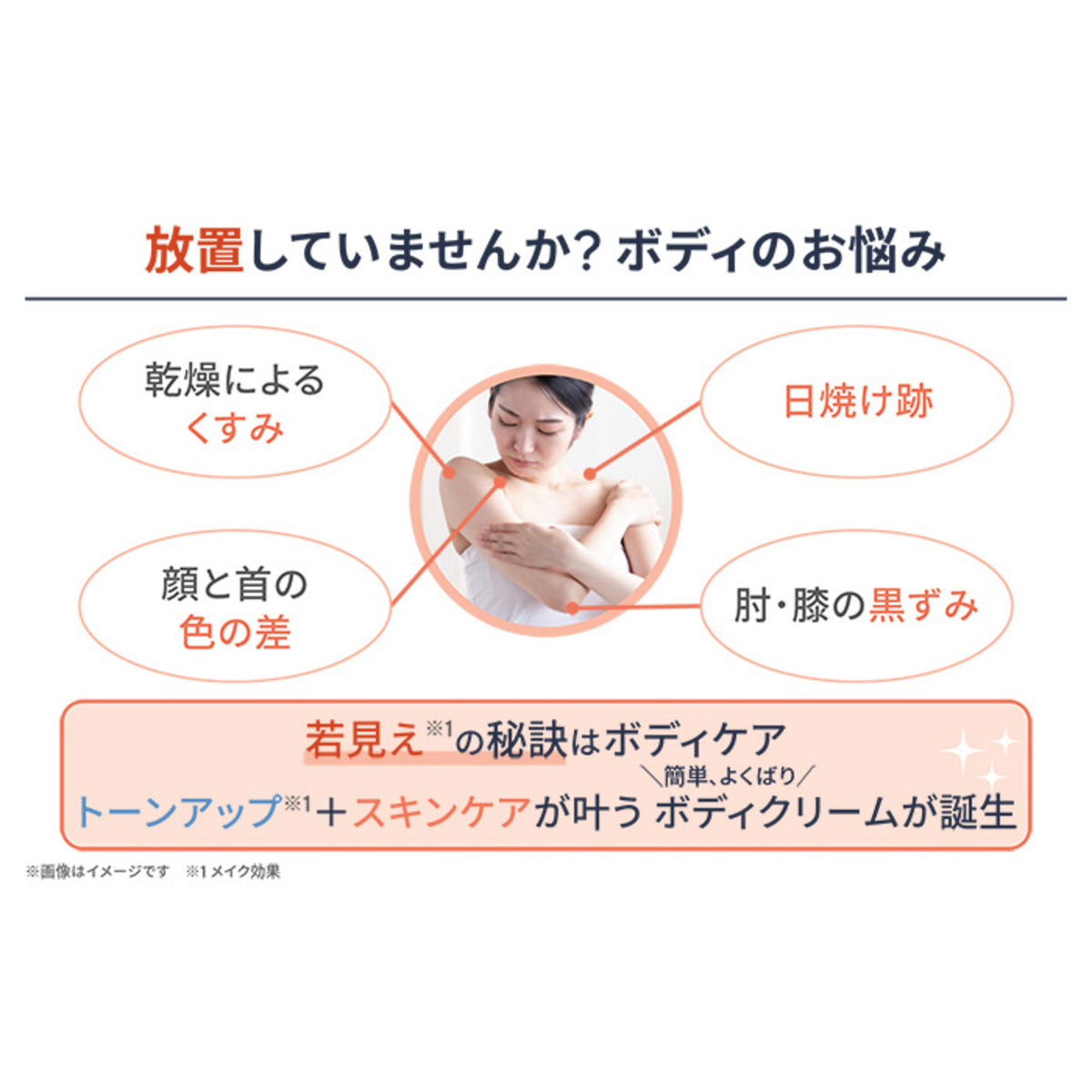 肌へしっかり密着し、長時間トーンアップ*をキープ。39種の美容成分を配合したボディトーンアップクリームです。ハリ・弾力成分、うるおい、保湿成分、肌荒れ防止成分、なめらかツヤ・キメ成分などを配合しました