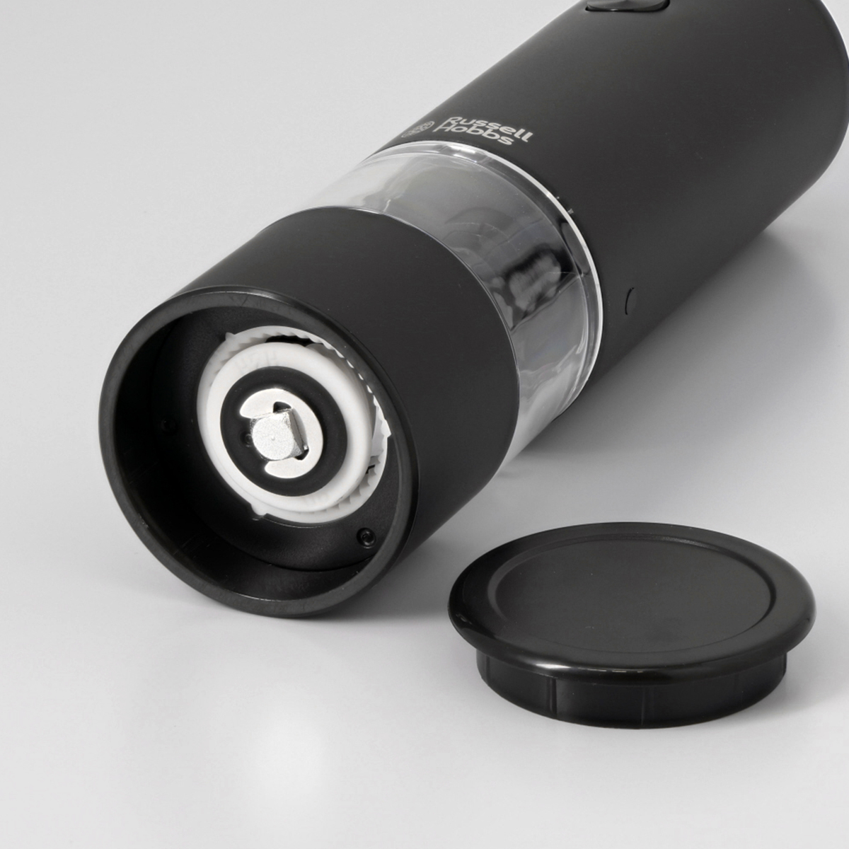 USB充電式(*1)のミル。LEDランプ下のスイッチを押すとグラインダーが回転し、キャビンの中の食材を電動で挽くことが可能(*2)。コンパクトなハンディサイズ(*3)で、料理の最後の仕上げにも、食事中の一足しにも便利です